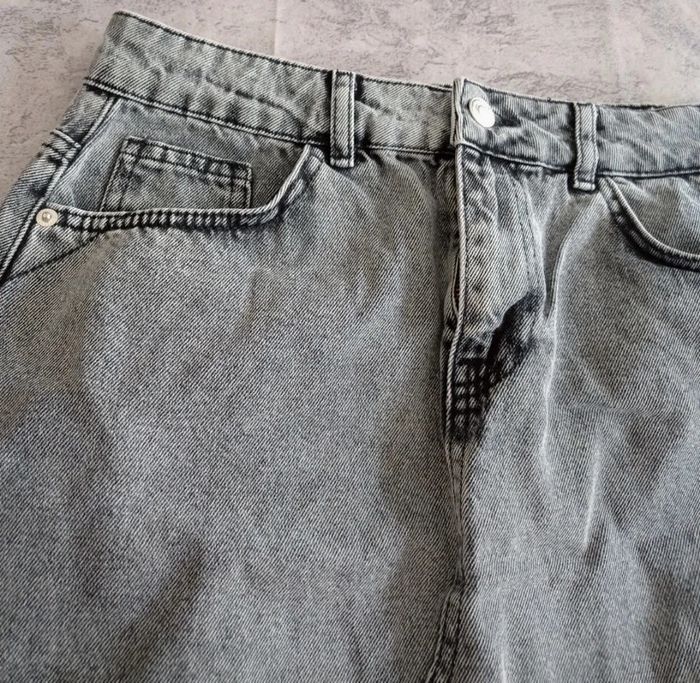 Jupe en jean taille haute, grise (denim) . Comme neuve car portée 1/2 fois. Gémo collection follow me. Taille 40.