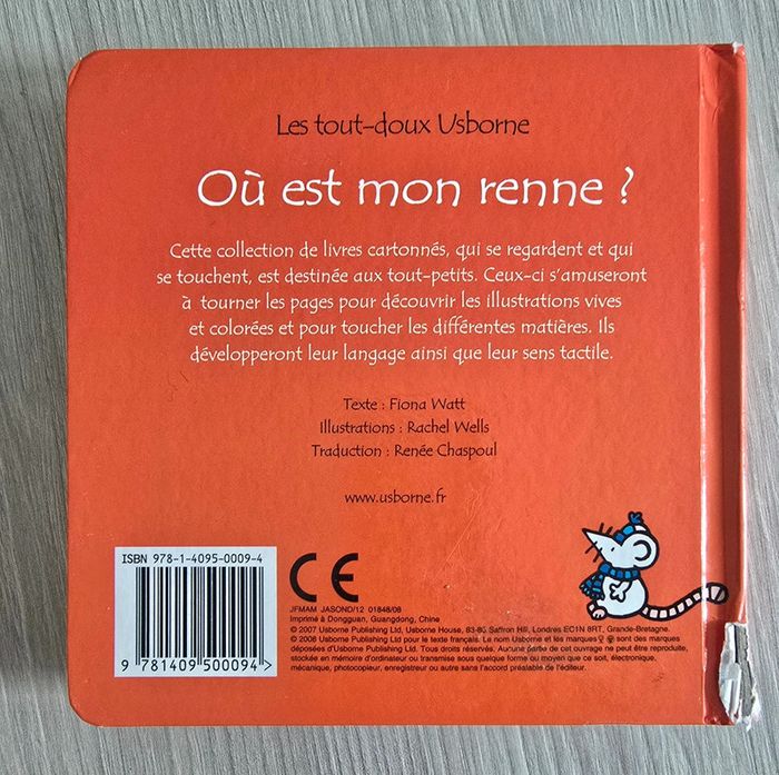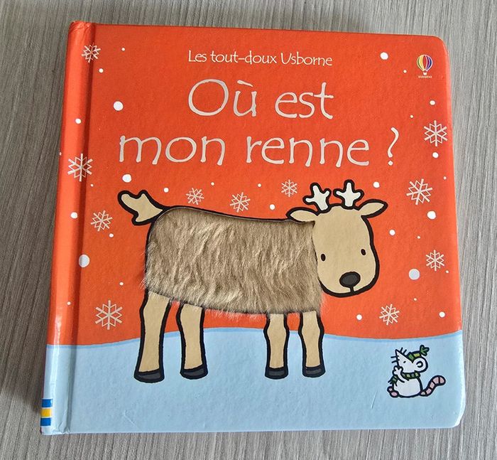 Livre tactile pour bébé, Où est mon renne? Parfait état hormis un endroit de la tranche un peu abîmé (ça ne bougera pas avec un morceau de scotch). Collection les tout-doux Usborne