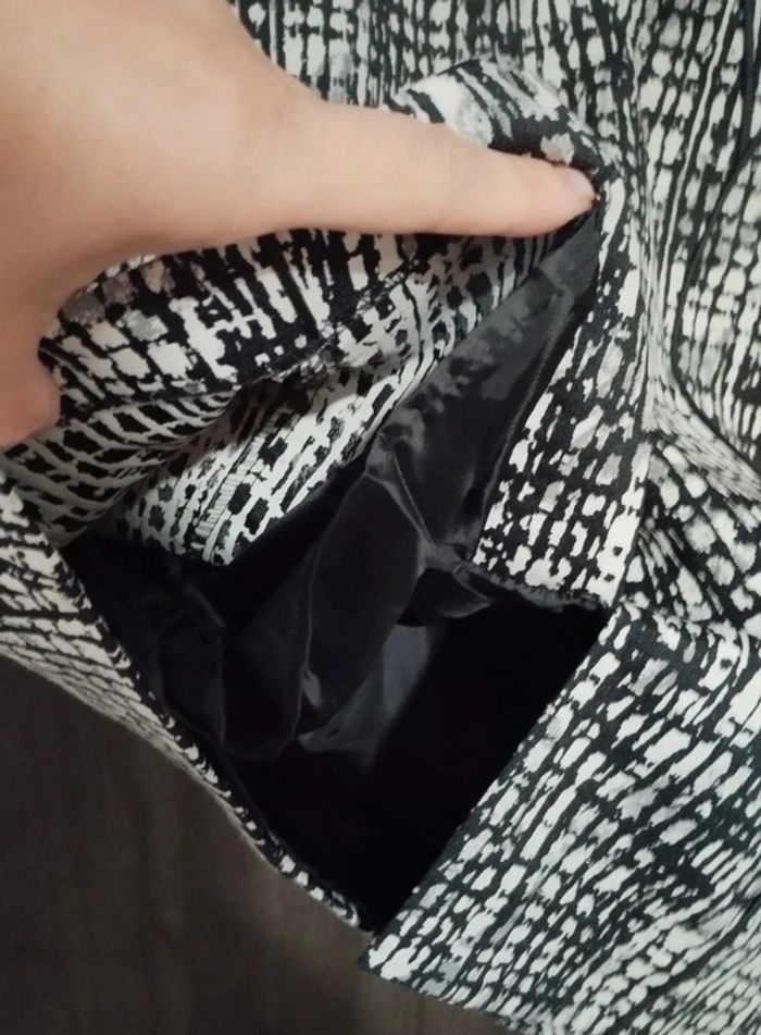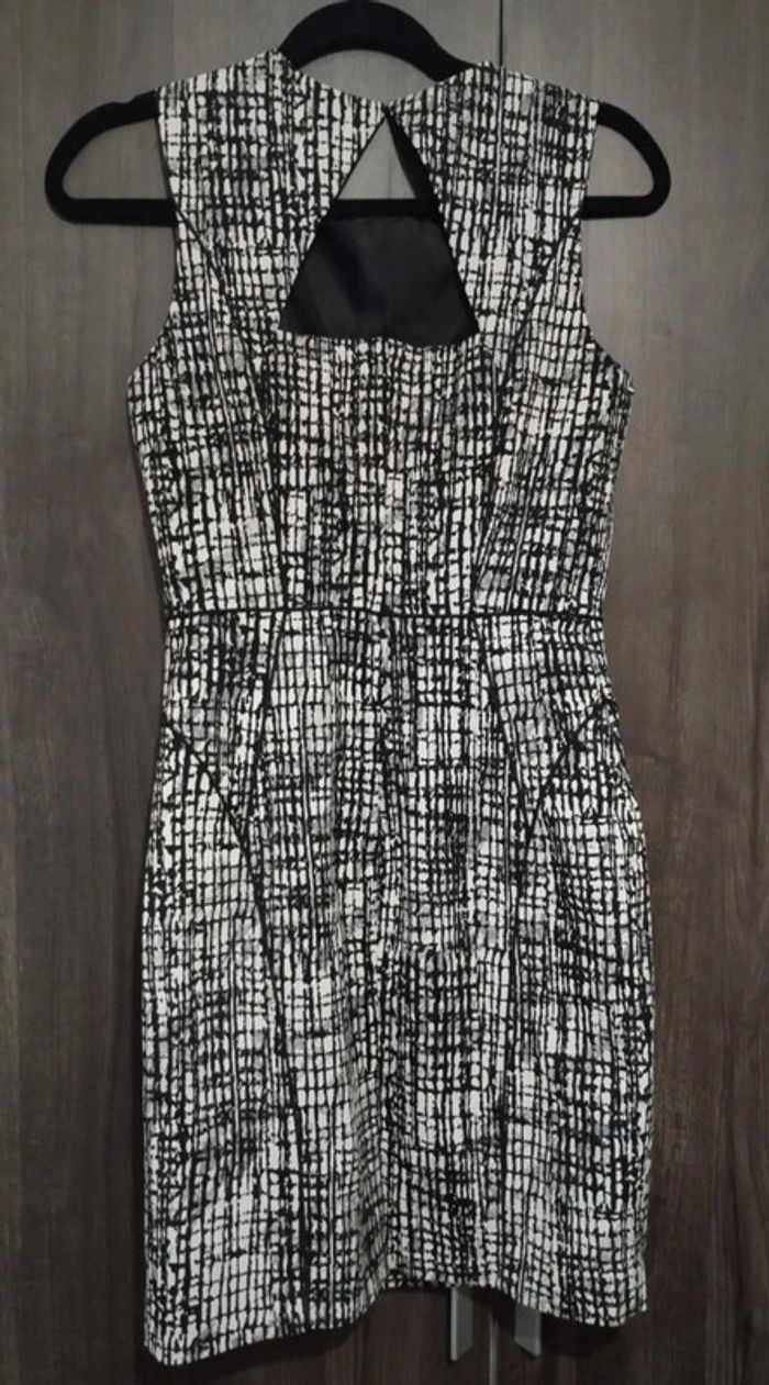 Robe cintrée, près du corps. Neuve. Avec doublure. Taille 38. Motifs noirs et blancs. Ouverture en triangle dans le dos