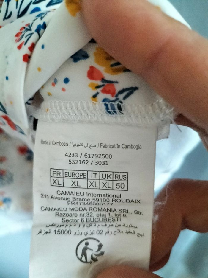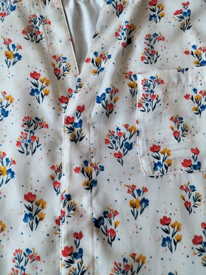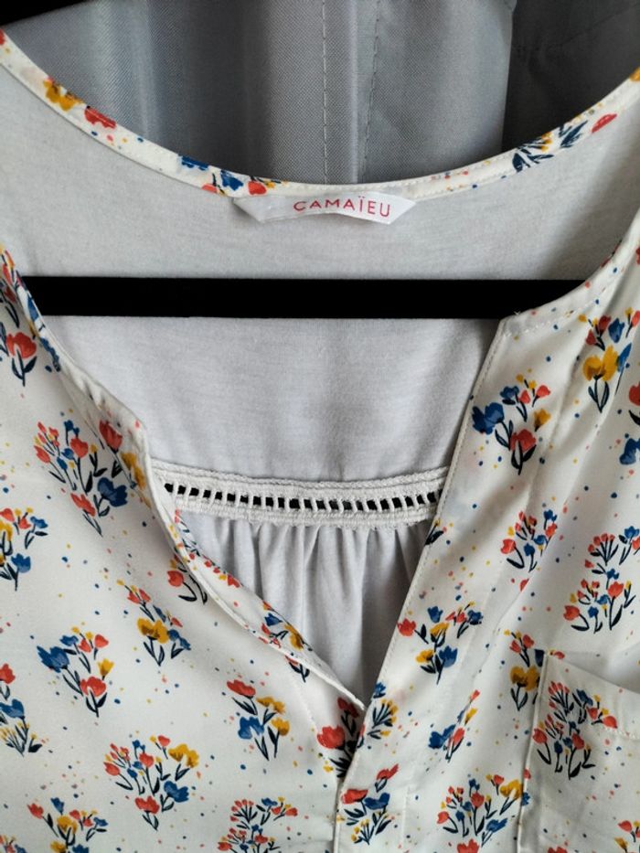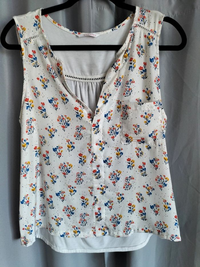 Blouse sans manche unie dos, fleurie devant, longueur 60 cm et largeur aisselle à aisselle 50 cm. Parfait état