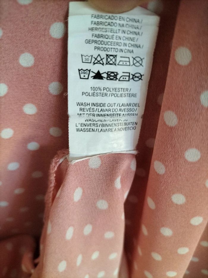 Blouse rose à pois blancs noté taille 46 mais je dirais plutôt taille 44. Longueur devant 66 cm, derrière 71 cm, largeur aisselle à aisselle 52 cm ⚠️⚠️ petite tâche très légère devant (voir dernière photo) sinon très bon état
