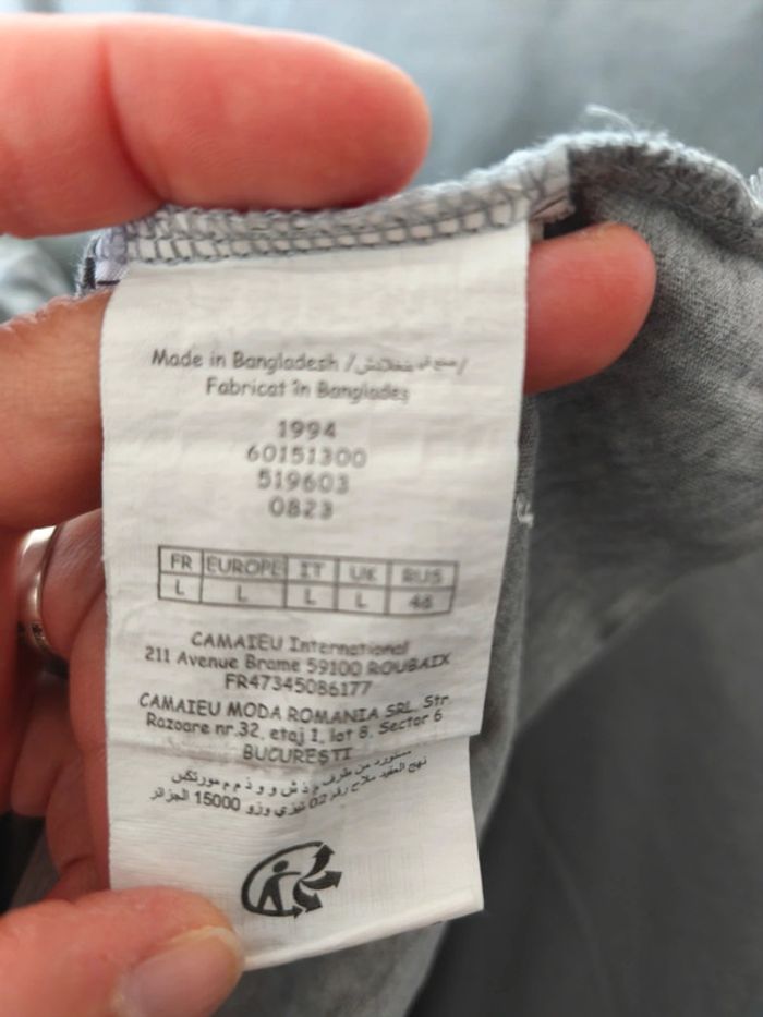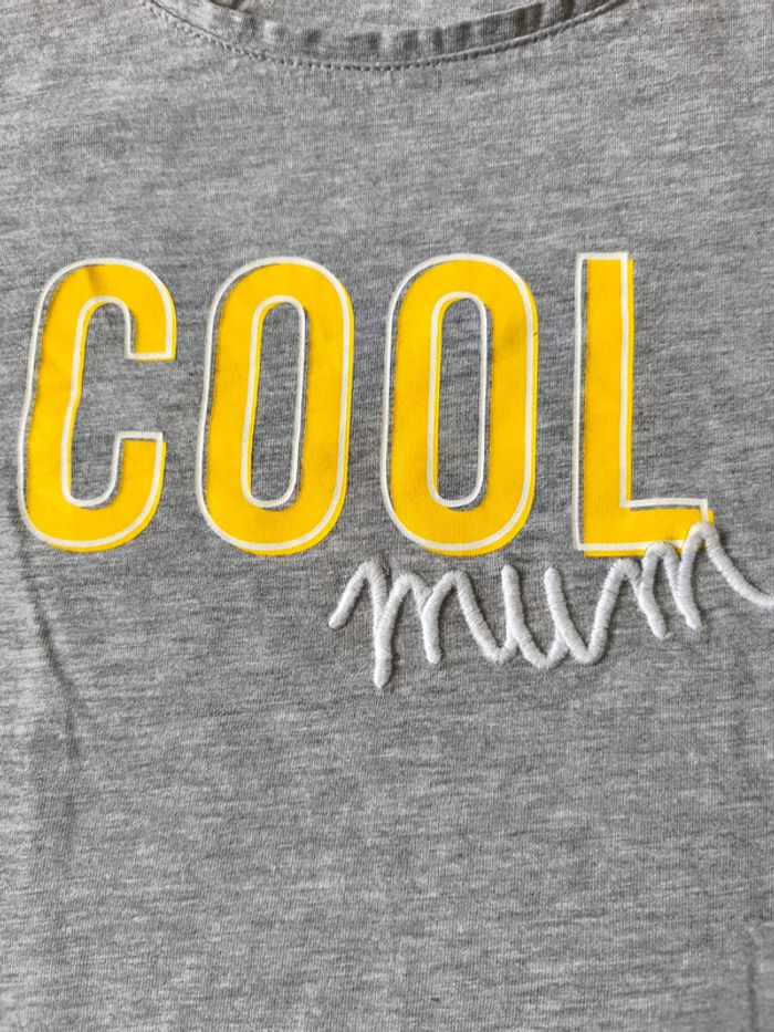 Tee-shirt manches courtes femme gris chiné inscription devant. Longueur 62 cm, largeur aisselle à aisselle 49 cm.