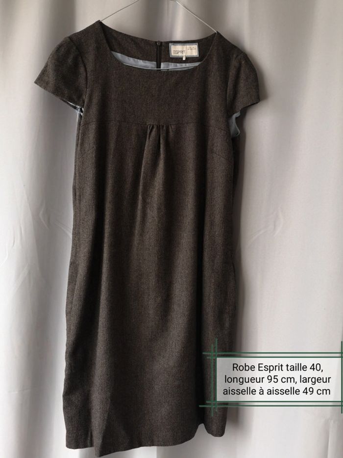 Robe Esprit taille 40 doublée (doublure décousue sous une aisselle, longueur 95 cm, largeur aisselle à aisselle 49 cm Très bon état sauf l'endroit décousu