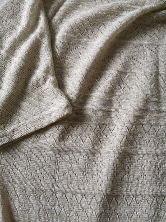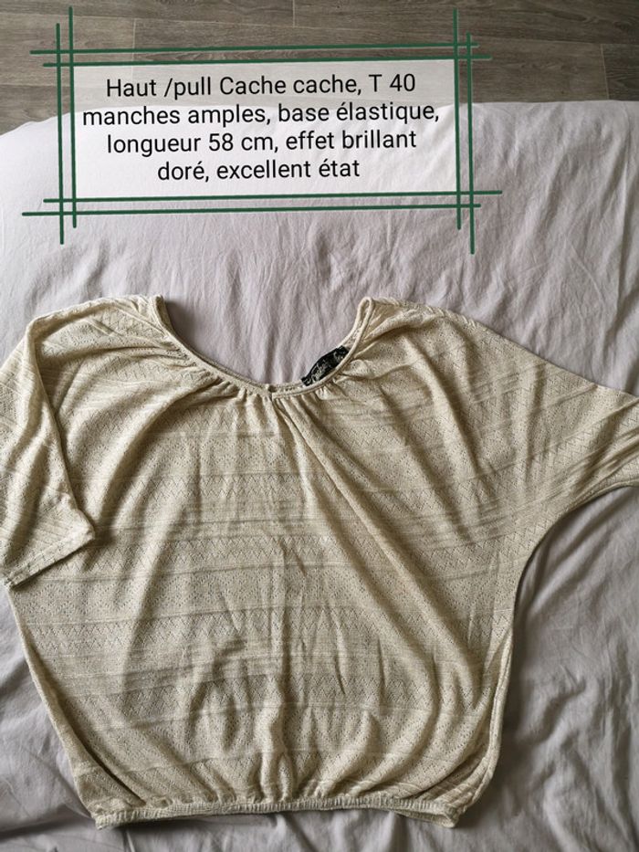 Haut, pull manches amples cache cache T 40, base élastique, effet brillant doré, longueur 58 cm, excellent état