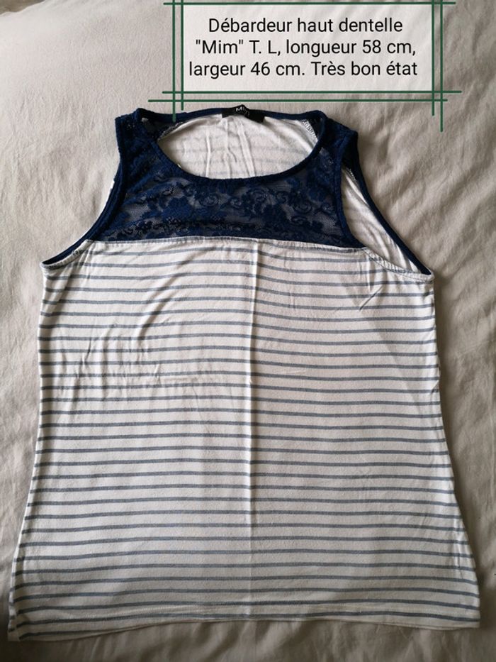 Débardeur rayé Mim taille L, longueur 58 cm, largeur aisselle à aisselle 46 cm. Motif dentelle. Très bon état