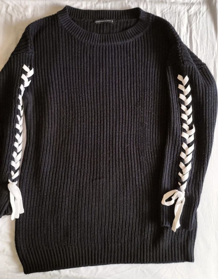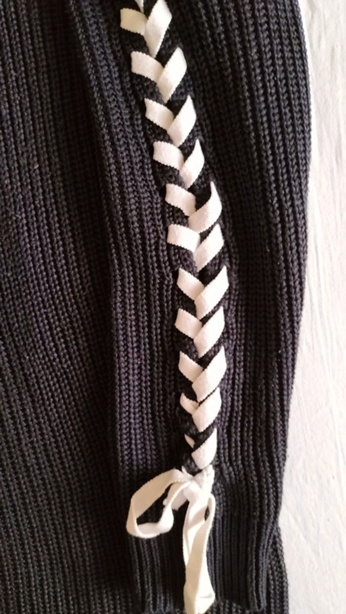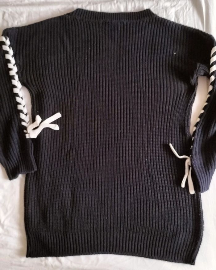 Pull noir grosses mailles avec laçage fantaisie sur les manches. Longueur 70 cm et largeur aisselle à aisselle 50 cm. Excellent état, peu porté.