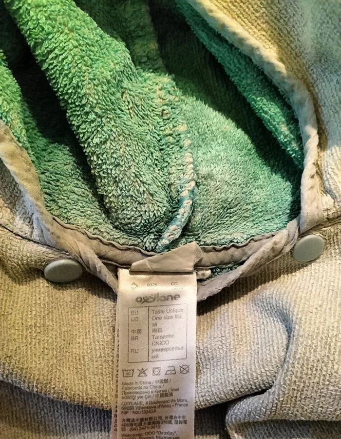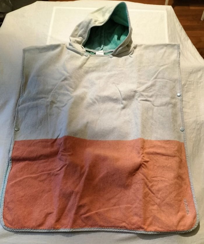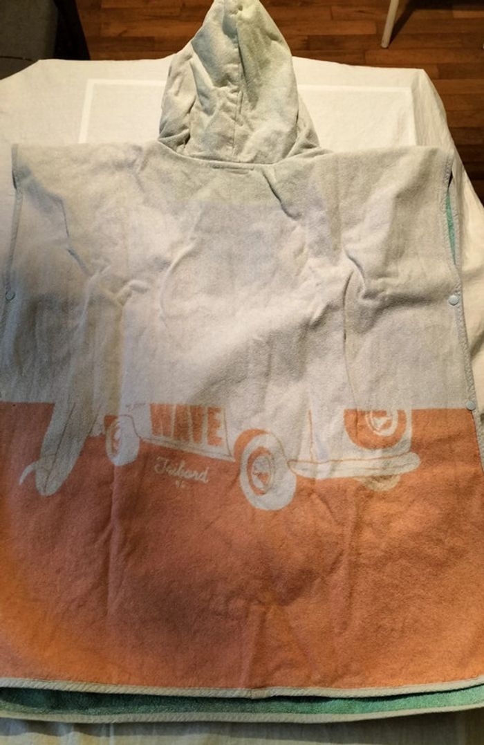 Sortie de bain garçon taille unique, Oxylane. Idéal pour la sortie de bain, la piscine et la plage. 2 boutons pression de chaque côté pour les manches. Longueur 74 cm et largeur 63 cm. À beaucoup servie , les couleurs sont un peu délavées mais reste en bon état.