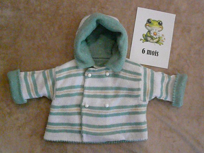 Manteau doublé totalement réversible avec capuche : - 1 face verte, - 1 face à rayures vertes et jaunes. Taille 6 mois. Fait main. Très bon état. N’hésitez pas à regarder mes autres annonces pour réduire les frais de port.