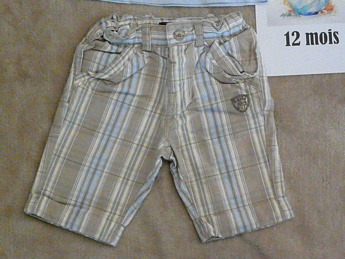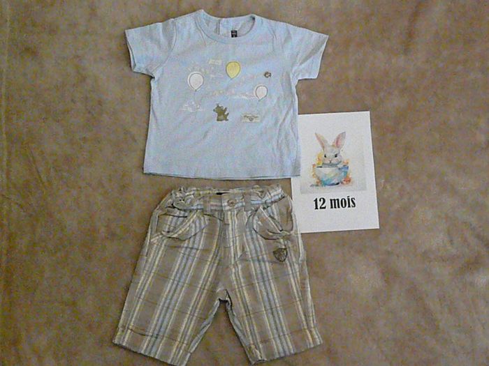 Ensemble Marque Sergent Major composé de : - Un bermuda beige à rayures jaune pâle et bleu ciel – ceinture ajustable, - Un tee-shirt bleu ciel assorti – avec boutons pressions dans le haut du dos. Très bon état. N’hésitez pas à regarder mes autres annonces pour réduire les frais de port.