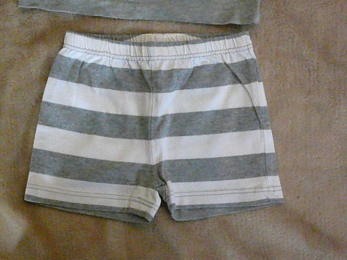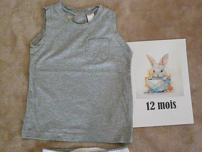 Ensemble taille 12 mois composé de : - Un short à rayures gris et blanc, - Un débardeur gris assorti – avec boutons pressions dans le haut du dos. Très bon état. N’hésitez pas à regarder mes autres annonces pour réduire les frais de port.