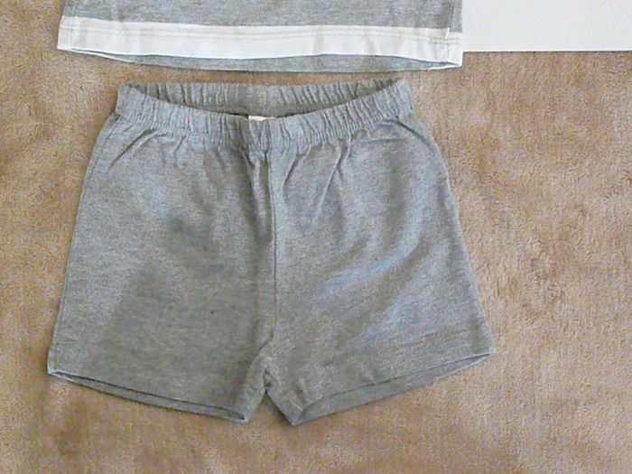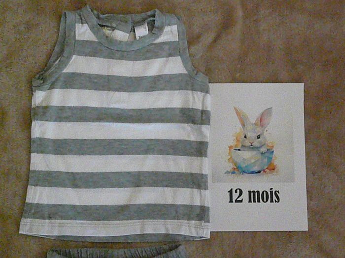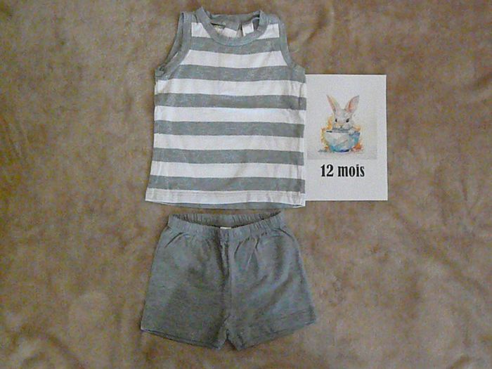 Ensemble taille 12 mois composé de : - Un short gris, - Un débardeur à rayures gris et blanc assorti – avec boutons pressions dans le haut du dos. Très bon état. N’hésitez pas à regarder mes autres annonces pour réduire les frais de port.