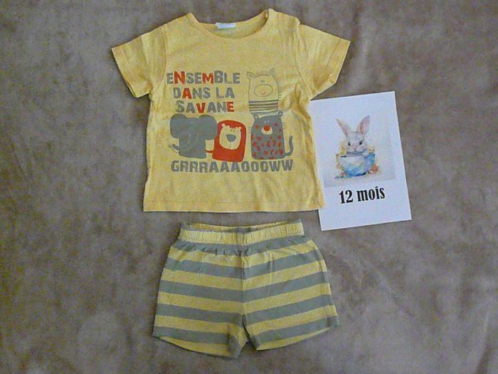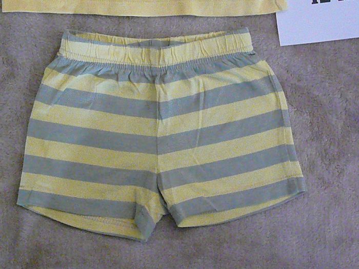 Ensemble composé de : - Un short à rayures grises et jaunes, - Un tee-shirt assorti – avec boutons pressions à l’épaule. Très bon état. N’hésitez pas à regarder mes autres annonces pour réduire les frais de port.