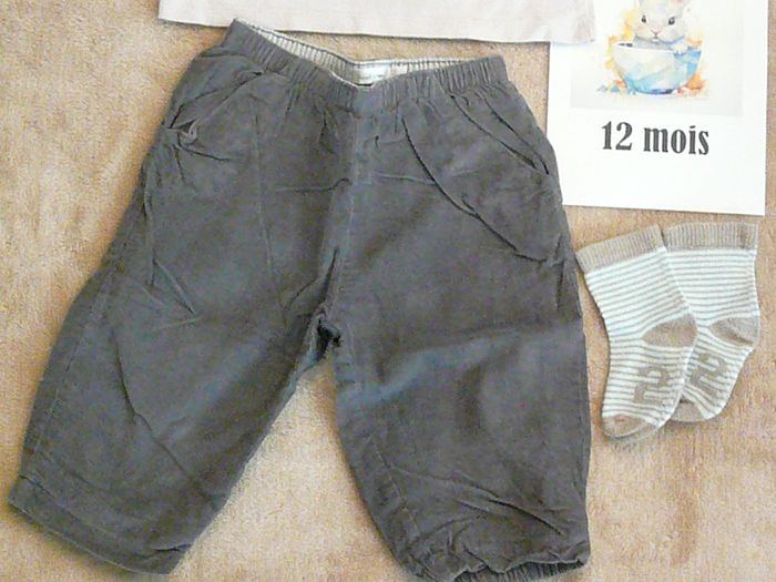 Ensemble composé de : - Un pantalon doublé, en velours gris, - Un tee-shirt assorti – avec boutons pressions à l’épaule, - Une paire de chaussettes assorties. Très bon état. N’hésitez pas à regarder mes autres annonces pour réduire les frais de port.