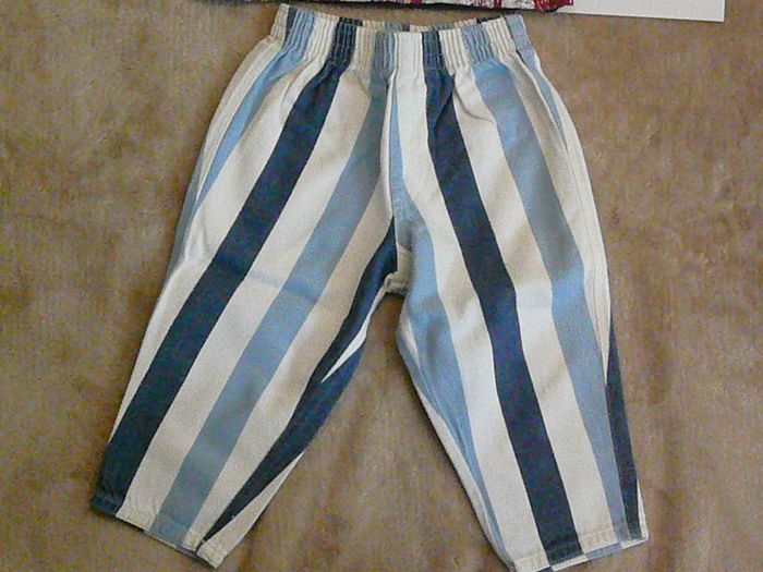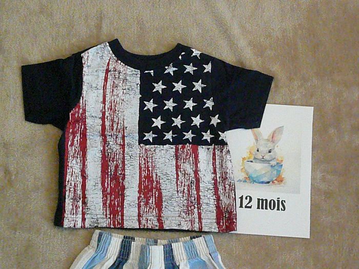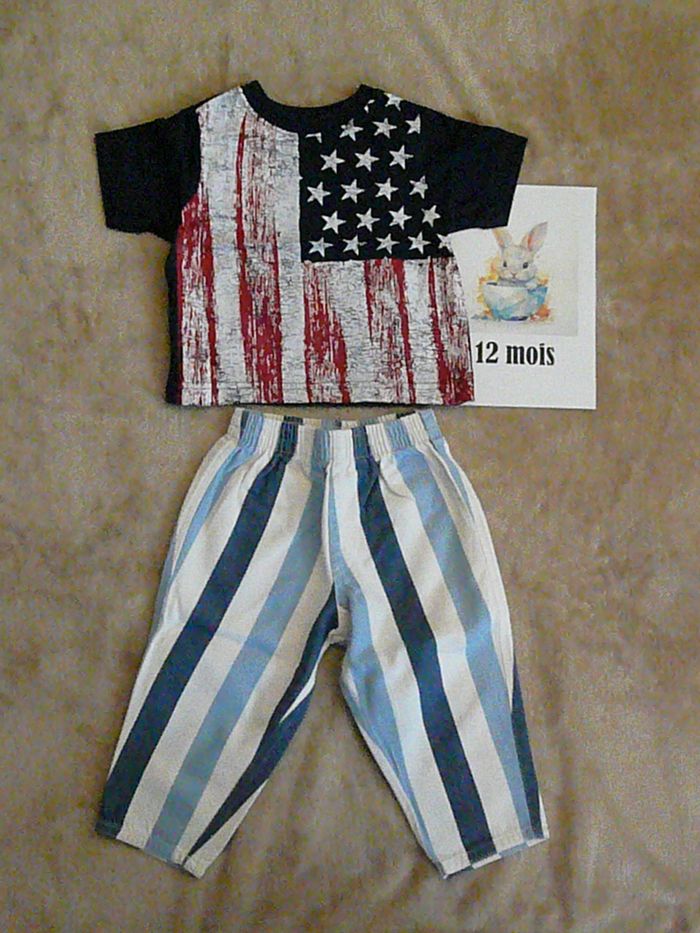 Ensemble composé de : - Un pantalon blanc à rayures bleu marine et bleu ciel, - Un tee-shirt bleu motif drapeau américain Marque Est 1989 Place. Très bon état. N’hésitez pas à regarder mes autres annonces pour réduire les frais de port.