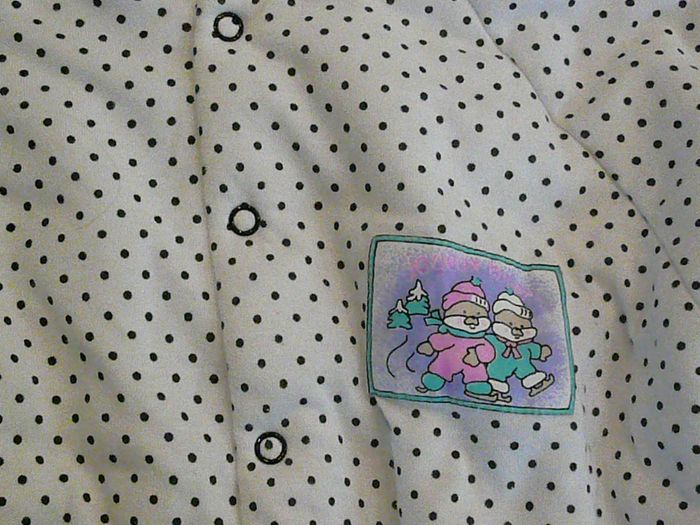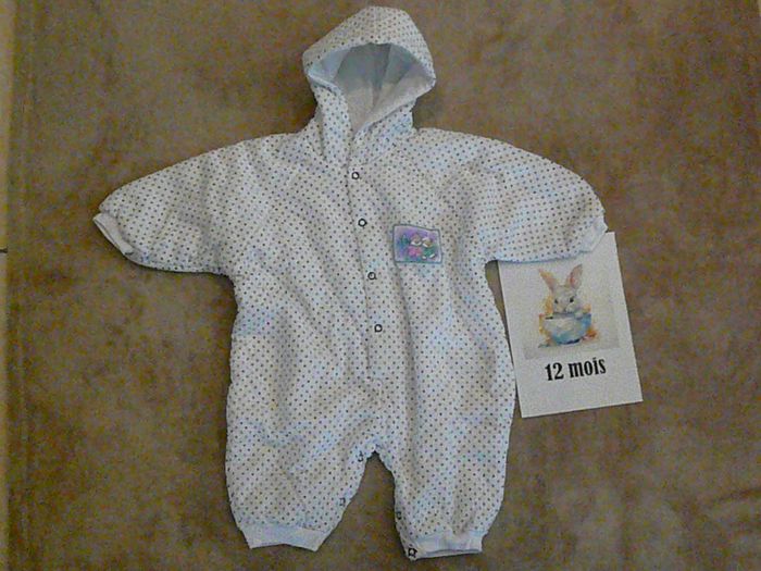 Combinaison blanche à pois noirs avec capuche. Taille 12 mois. Avec boutons pressions sur le devant et à l’entrejambe. Peut servir de surpyjama. Très bon état. N’hésitez pas à regarder mes autres annonces pour réduire les frais de port.