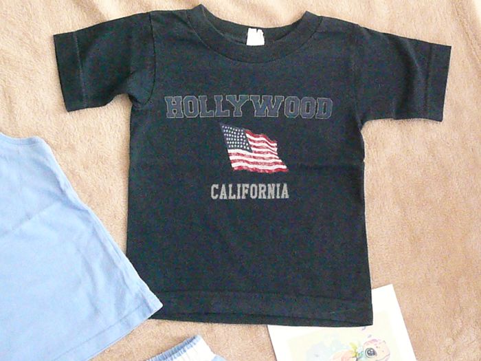 Ensemble composé de : - Un short à rayures bleu et blanc, - Un débardeur bleu assorti, - Un tee-shirt bleu marine Hollywood. Très bon état. N’hésitez pas à regarder mes autres annonces pour réduire les frais de port.