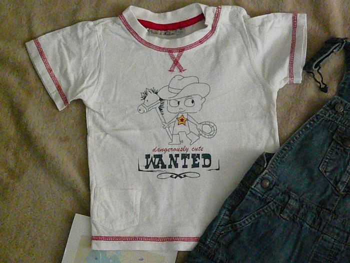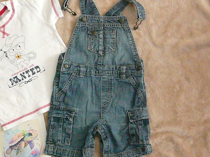 Ensemble composé de : - Une salopette en jean – Marque Obaibi Avec pressions à l’entrejambe et bretelles réglables, - Un tee-shirt blanc à motif – avec boutons pressions à l’épaule. Très bon état. N’hésitez pas à regarder mes autres annonces pour réduire les frais de port.