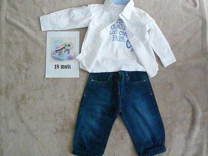 Ensemble 3 pièces composé de : - Un jean avec ceinture réglable, - Un tee-shirt assorti – avec boutons pressions à l’épaule, - Une chemise blanche à manches longues pouvant être repliées. Très bon état. N’hésitez pas à regarder mes autres annonces pour réduire les frais de port.