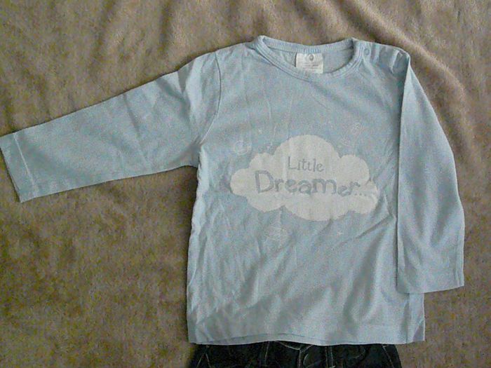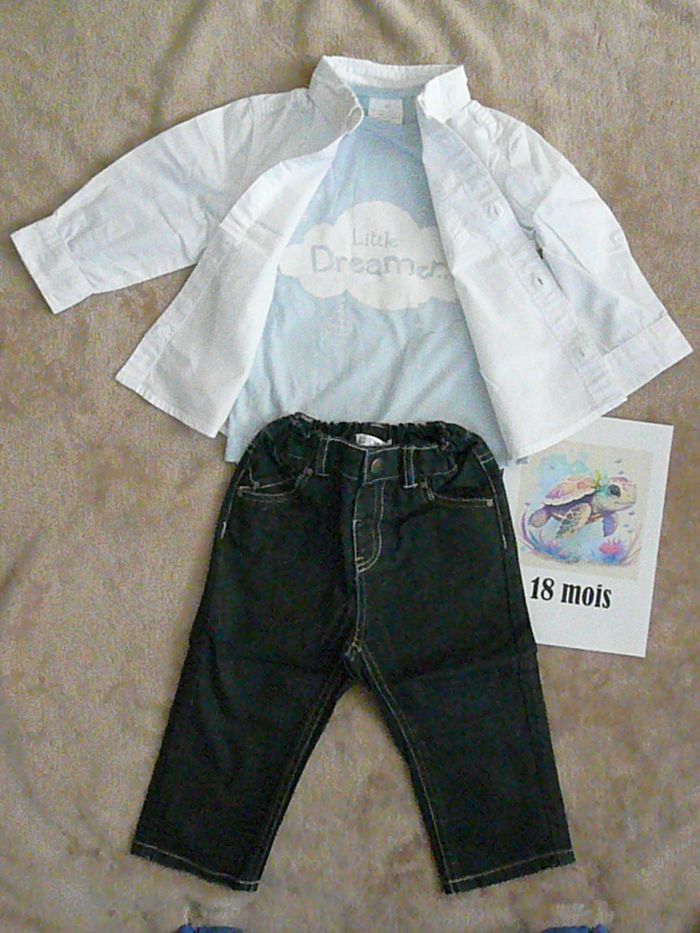 Ensemble 3 pièces composé de : - Un jean noir avec ceinture réglable, - Un tee-shirt bleu ciel assorti – avec boutons pressions à l’épaule, - Une chemise blanche à manches longues avec motif dans le dos. Très bon état. N’hésitez pas à regarder mes autres annonces pour réduire les frais de port.
