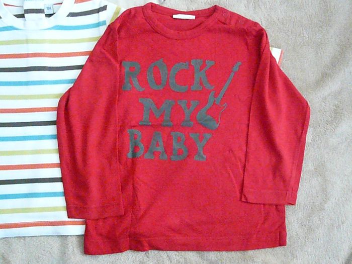 Lot de 3 tee-shirts manches longues - Taille 18 mois : - Un tee-shirt beige à motif noir – avec boutons pressions à l’épaule, - Un tee-shirt à rayures – avec boutons dans le haut du dos, - Un tee-shirt rouge à écritures noires – avec boutons pressions à l’épaule. Très bon état. N’hésitez pas à regarder mes autres annonces pour réduire les frais de port.