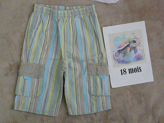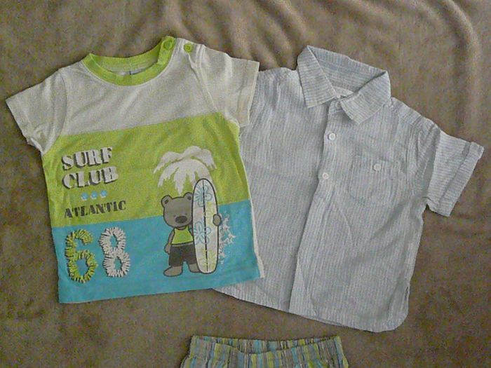 Ensemble 3 pièces composé de : - Un pantacourt à rayures avec ceinture élastique, - Un tee-shirt à motif assorti – avec boutons à l’épaule, - Une chemise manches courtes blanche à fines rayures bleu ciel. Très bon état. N’hésitez pas à regarder mes autres annonces pour réduire les frais de port.