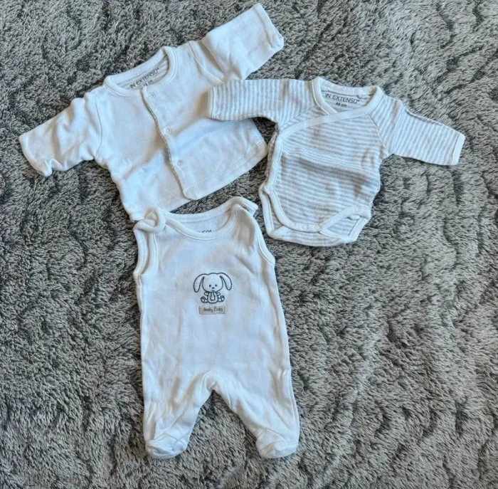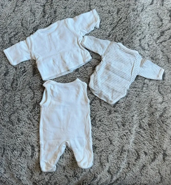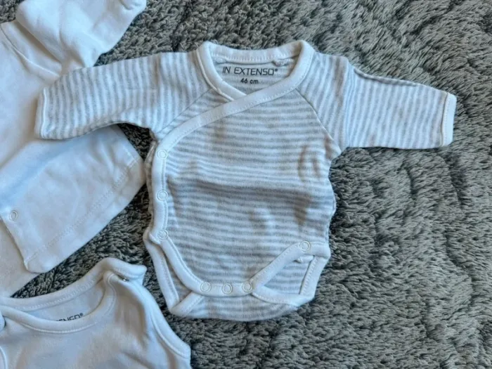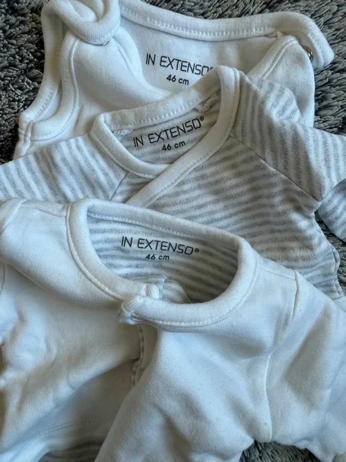 Ensemble composé d’un pyjamas sans manches, d’une veste et d’un body manches longues le tout assorti, couleur blanc donc peut convenir à une fille ou un garçon, tout est NEUF (jamais portés mais ont été lavés car mon préma n’était pas si petit que ça), de la marque In extenso - taille 46 cm #cath_moiprémagarçon #cath_moiprémafille #cath_moinaissancegarçon #cath_moinaissancefille D'autres vêtements et chaussures de marques disponibles pour garçon du prématuré au 12 ans et pour fille du naissance au 8 ans dont Timberland, Bout'chou, Zara, Jacadi, Tape à l'œil, Okaidi, DKNY, Monoprix…