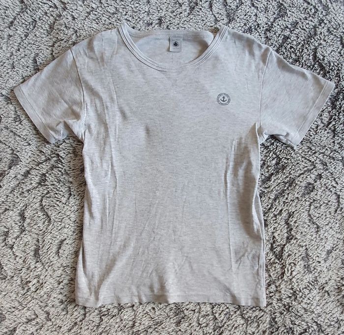 Tee-shirt manches courtes gris clair style tricot de peau, logo de la marque sur le devant, marque Petit Bateau, en très bon état - taille 12 ans #cath_moi12ansgarçon D'autres modèles et marques disponibles pour garçon du prématuré au 12 ans et pour fille du naissance au 8 ans dont Timberland, Bout'chou, Zara, Jacadi, Tape à l'œil, Okaidi, DKNY, Monoprix....