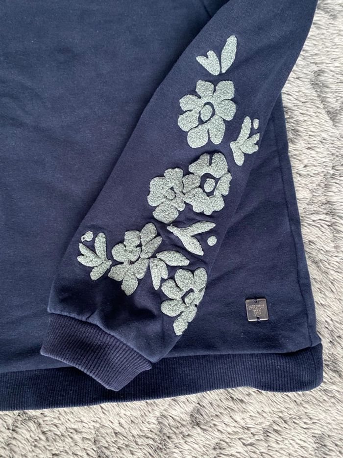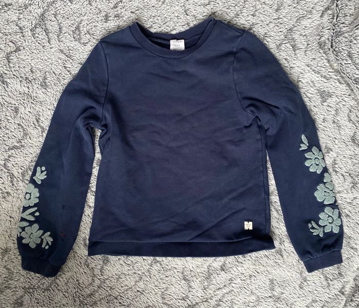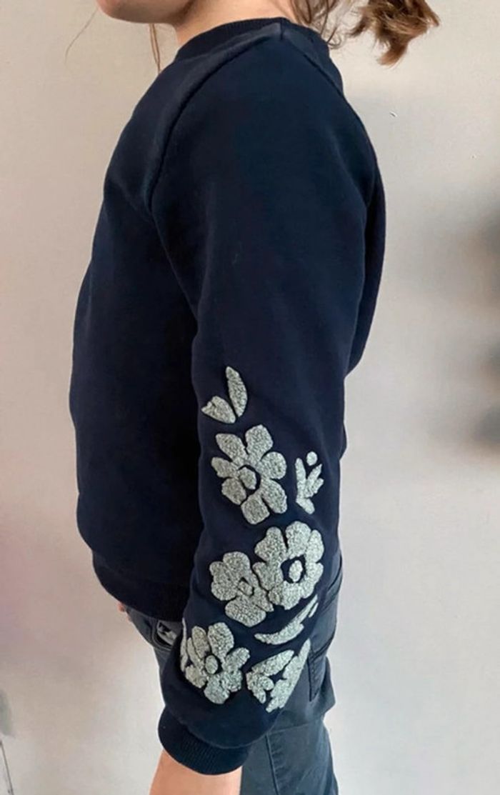 Pull bleu marine avec détail broderies en forme de fleurs sur les bras, marque Carrément Beau, création française 🇫🇷, en très bon état - taille 10 ans mais taille petit #cath_moi8ansfille #cath_moi10ansfille D'autres modèles et marques disponibles pour garçon du prématuré au 12 ans et pour fille du naissance au 10 ans