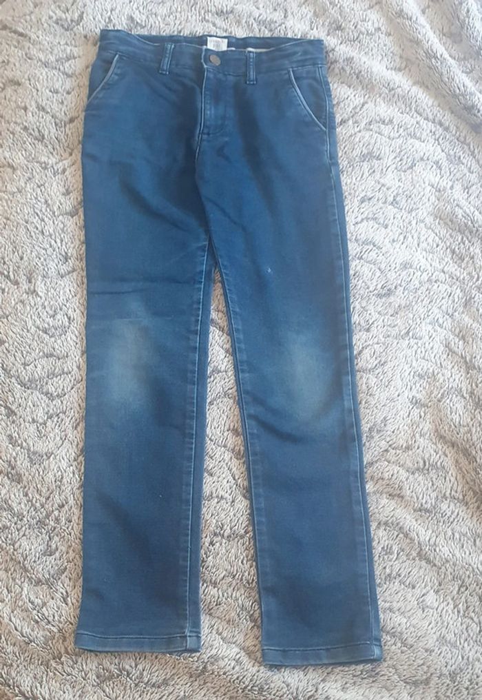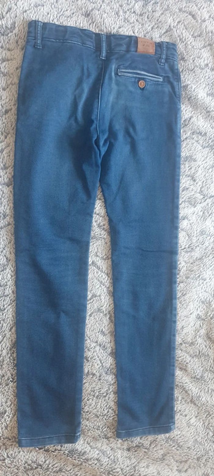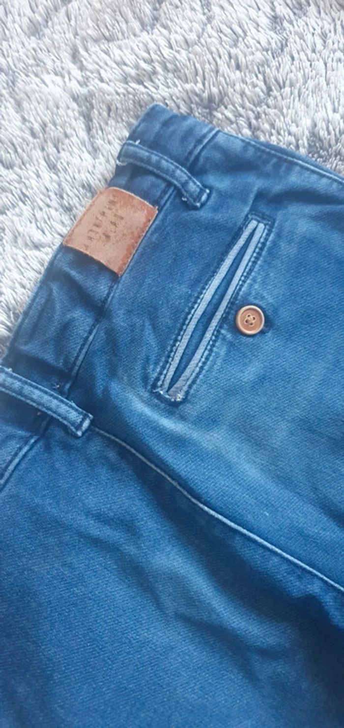 Jeans style chino , couleur bleu, marque Carrément Beau , en bon état mais petit défaut (accro sur la cuisse gauche - voir dernière photo) d'où le prix de vente - taille 10 ans