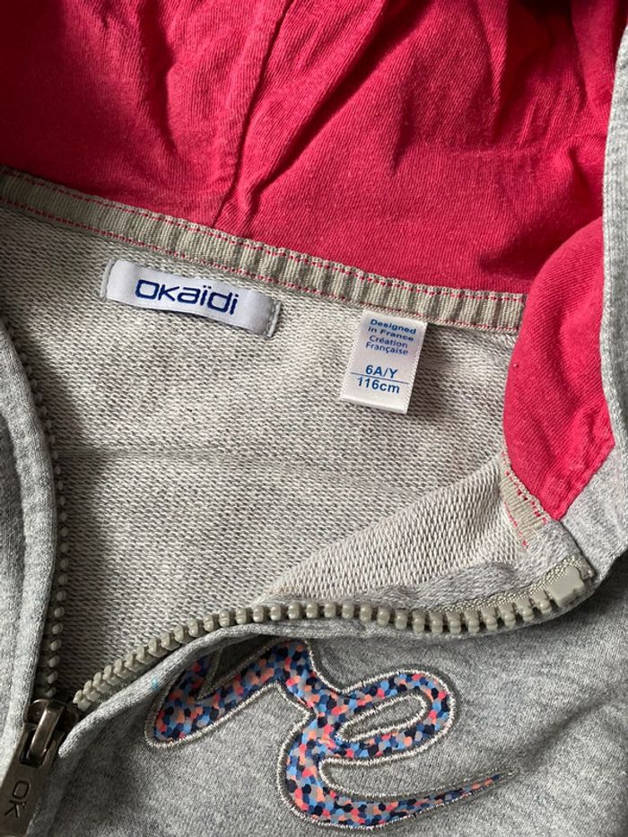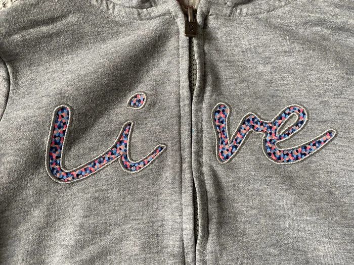 Veste de sport à capuche, de la marque Okaidi , couleur gris clair avec écriture « live » ton rose sur le devant, en bon état - taille 6 ans #cath_moi6ansfille D'autres chaussures et vêtements disponibles pour garçon du prématuré au 10 ans et pour fille du naissance au 6 ans dont Timberland, Bout'chou, Zara, Jacadi, Tape à l'œil, Okaidi, DKNY, Monoprix...