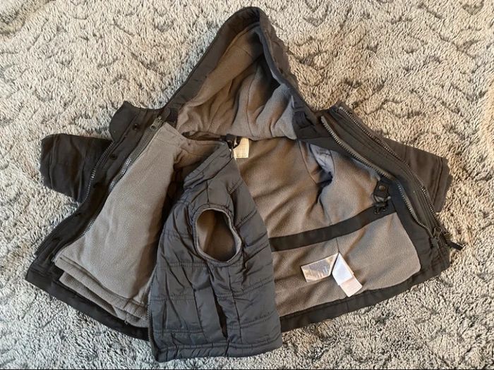 Manteau Verbaudet qui peut être utilisé avec la doublure / sans la doublure / juste avec la doublure qui se transforme en petite doudoune sans manche (voire sur les différentes photos) - taille 2 ans mais vous pourrez le mettre plus longtemps car il taille grand En très bon état (très peu porté) #cath_moi24moisgarçon D'autres modèles et marques disponibles pour garçon du prématuré au 10 ans et pour fille du naissance au 6 ans dont Timberland, Bout'chou, Zara, Jacadi, Tape à l'œil, Okaidi, DKNY, Monoprix....