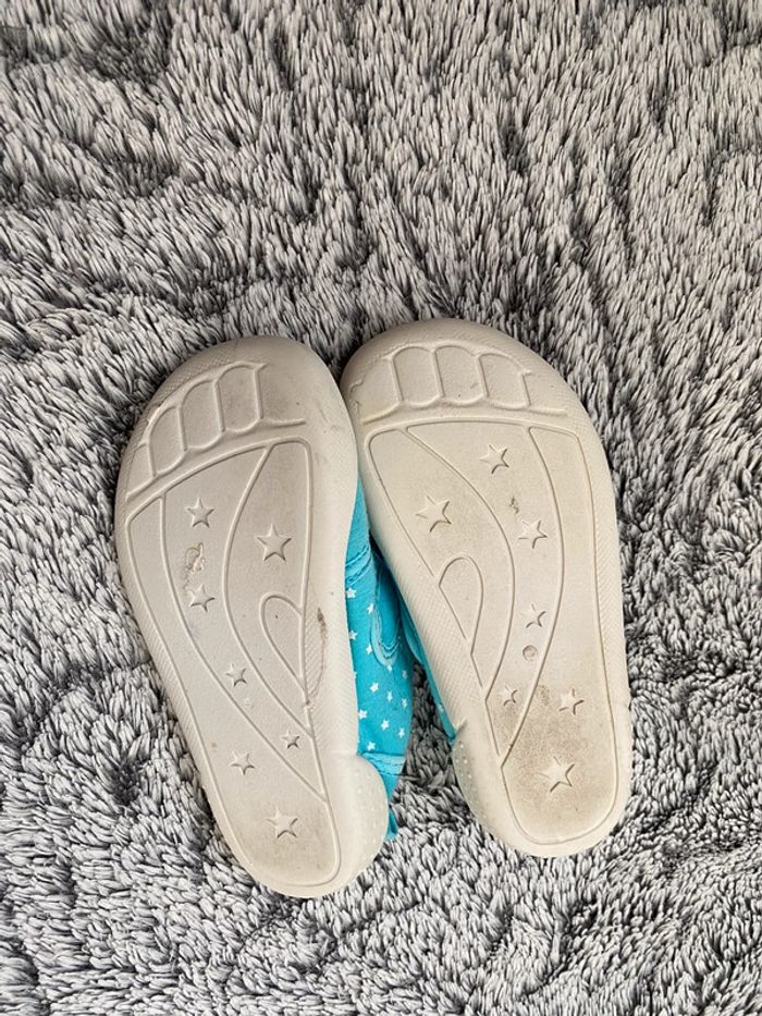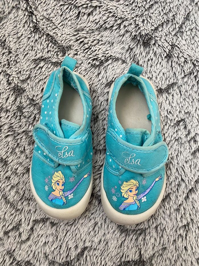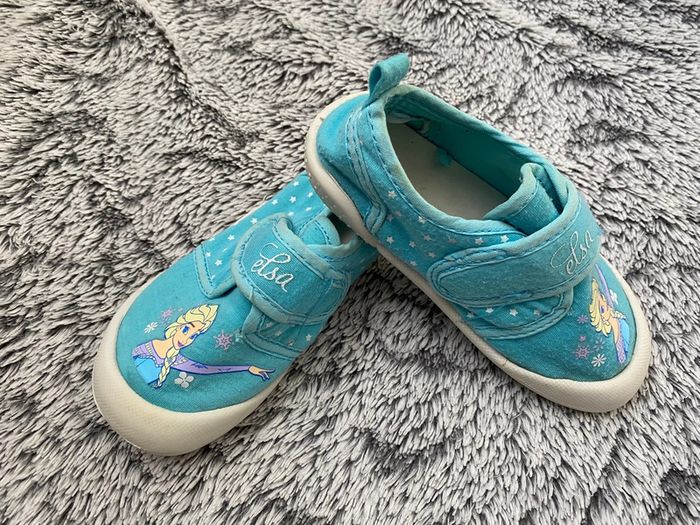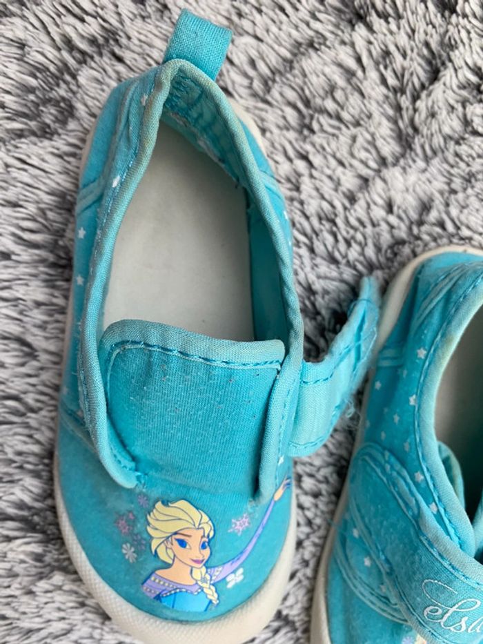 Chaussons bleu, motif Elsa de la Reine des neiges , en bon état ( peu portés car utilisés uniquement chez les grands-parents ) - taille 25 (étiquette de la taille coupée mais correspond à du 25)