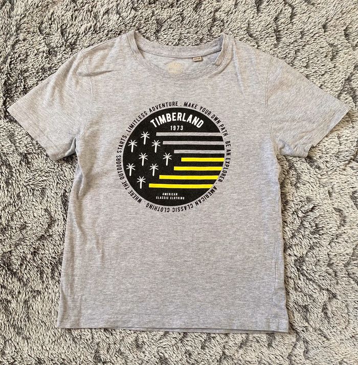 Tee-shirt manches courtes , de la marque Timberland, gris avec motif sur le devant, en bon état - taille 10 ans #cath_moi10ansgarçon D'autres modèles et marques disponibles pour garçon du prématuré au 10 ans et pour fille du naissance au 6 ans dont Timberland, Bout'chou, Zara, Jacadi, Tape à l'œil, Okaidi, DKNY, Monoprix…