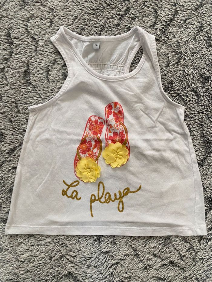 Débardeur blanc avec motif idéal été sur le devant, en bon état - taille 5 ans #cath_moi5ansfille D'autres vêtements et chaussures de marques disponibles pour garçon du prématuré au 10 ans et pour fille du naissance au 5 ans dont Timberland, Bout'chou, Zara, Jacadi, Tape à l'œil, Okaidi, DKNY, Monoprix....