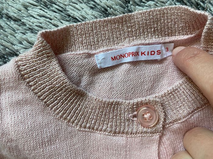Petit gilet rose pâle avec détails dorés aux extrémités, fin, marque Monoprix Kids, neuf (jamais portée juste lavée)- 36 mois #cath_moi36moisfille D'autres modèles et marques disponibles pour garçon du prématuré au 8 ans et pour fille du naissance au 4 ans dont Timberland, Bout'chou, Zara, Jacadi, Tape à l'œil, Okaidi, DKNY, Monoprix....