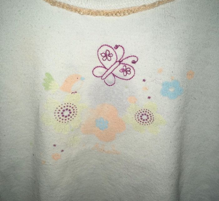Tee-shirt idéal de peau, blanc avec motifs fleurs sur le devant, de la marque Absorba - taille 2 ans #cath_moi24moisfille D'autres modèles et marques disponibles pour garçon du prématuré au 10 ans et pour fille du naissance au 5 ans dont Timberland, Bout'chou, Zara, Jacadi, Tape à l'œil, Okaidi, DKNY, Monoprix....