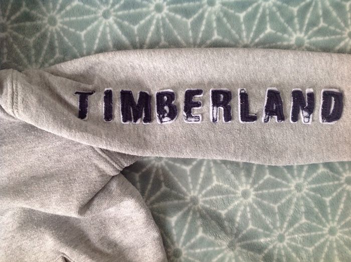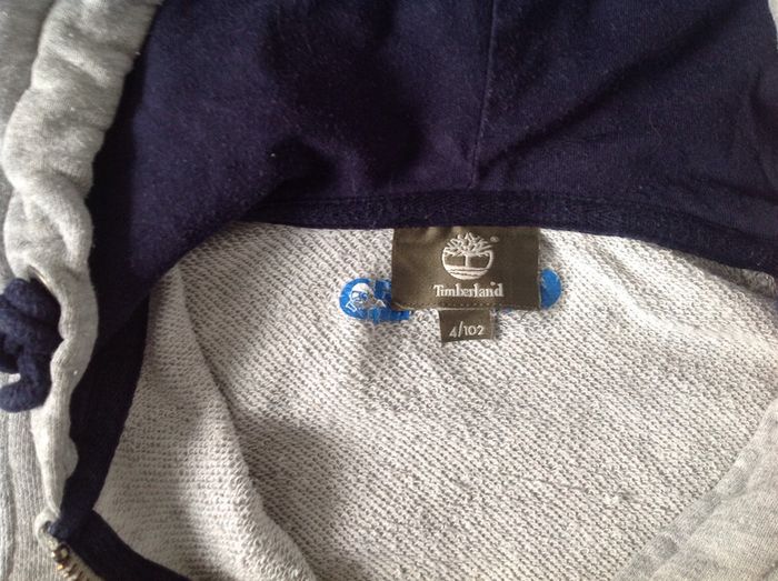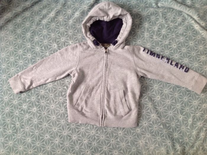 Veste à capuche Timberland grise - 4 ans - Etiquette thermocolante présente avec le prénom de mon fils que je n'ai pas réussi à retirer totalement - #cath_moi4ansgarçon D'autres modèles et marques disponibles pour garçon du prématuré au 8 ans, et pour fille du naissance au 36 mois dont Timberland, Bout'chou, Tape à l'œil, Okaidi, DKNY, Monoprix....
