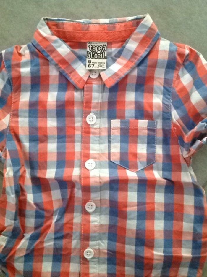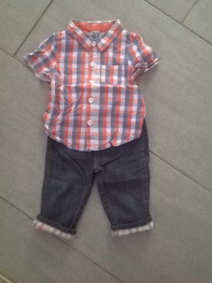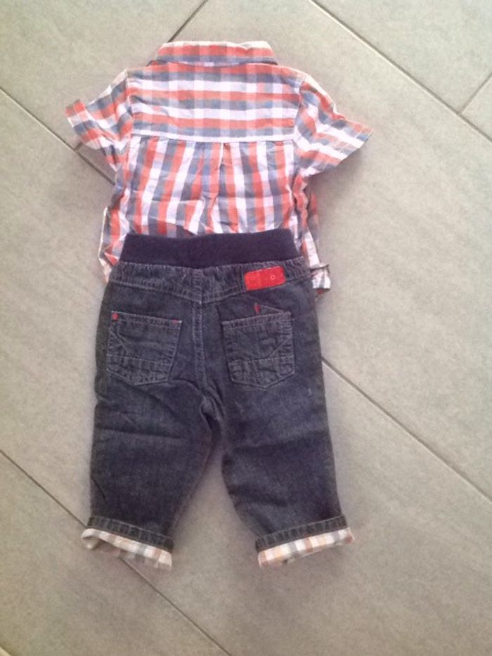 Ensemble 6 mois bébé garçon : Chemise tape à l'oeil à manches courtes Jeans Okaidi #cath_moi6moisgarçon