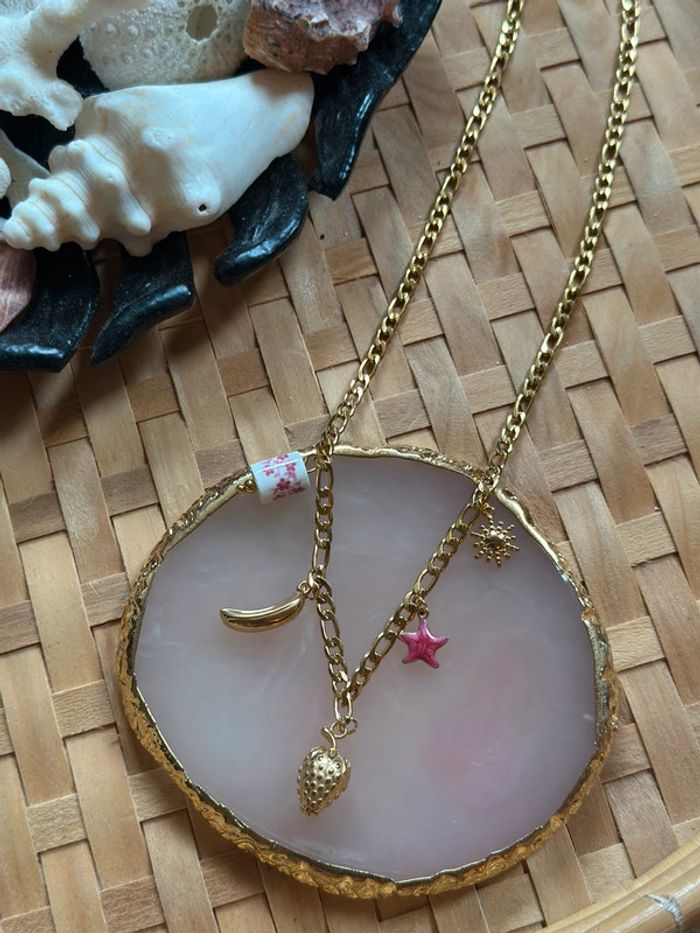 Collier doré en acier inoxydable avec plusieurs pendentifs originaux : étoile rose, fraise dorée, banane et petit soleil. Longueur réglable de 45 cm + 5 cm grâce à sa chaînette d’extension. Style tendance et décontracté, idéal pour apporter une touche originale à une tenue. Article neuf, jamais porté, vendu avec son pochon de protection.