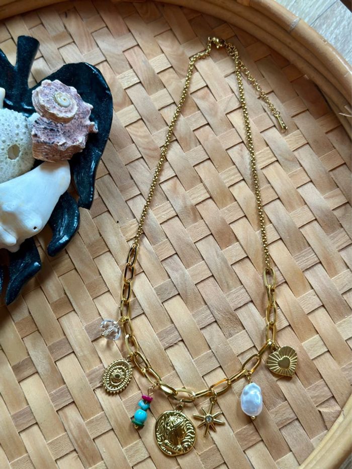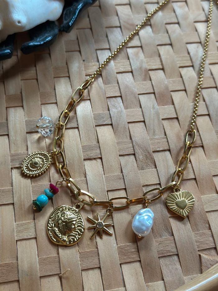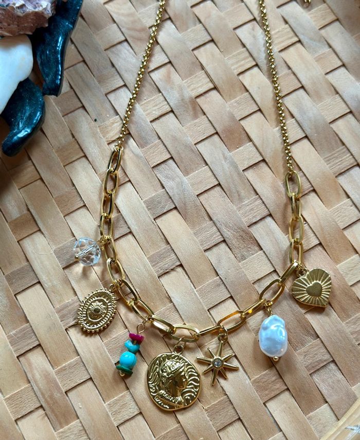 Collier doré en acier inoxydable pendentifs médailles et perles - photo numéro 1