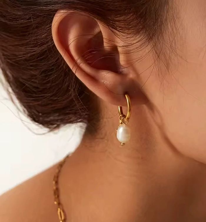 Boucles d’oreilles créoles dorées acier inoxydable avec perle d’eau douce naturelle - photo numéro 6