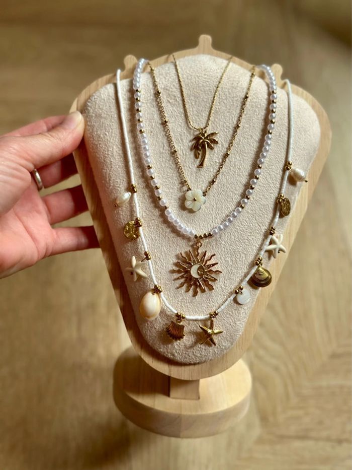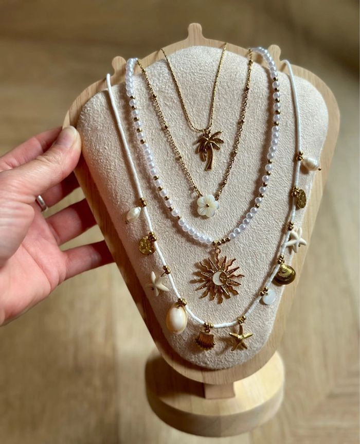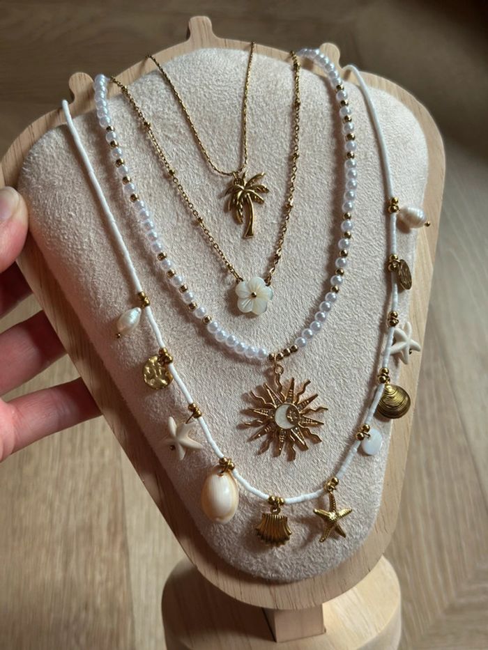 Jolis colliers neufs, chacun vendu avec son pochon de protection. Prix : 15 € pièce (merci de préciser le modèle choisi lors de l’achat). ✨ Caractéristiques : • Acier inoxydable (résistant et durable) • Réglables et ajustables (taille standard) • Avec perles naturelles, nacre ou breloques dorées selon les modèles • Style tendance et bohème chic, parfaits pour accessoiriser vos tenues d’été 📦 Envoi soigné et rapide, chaque collier est protégé dans son pochon individuel.