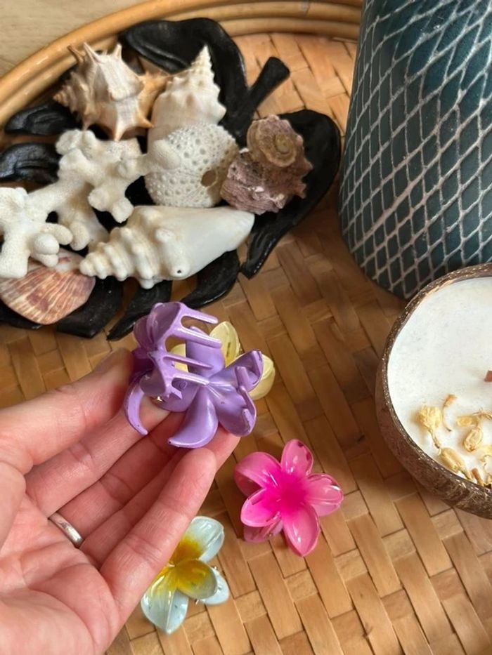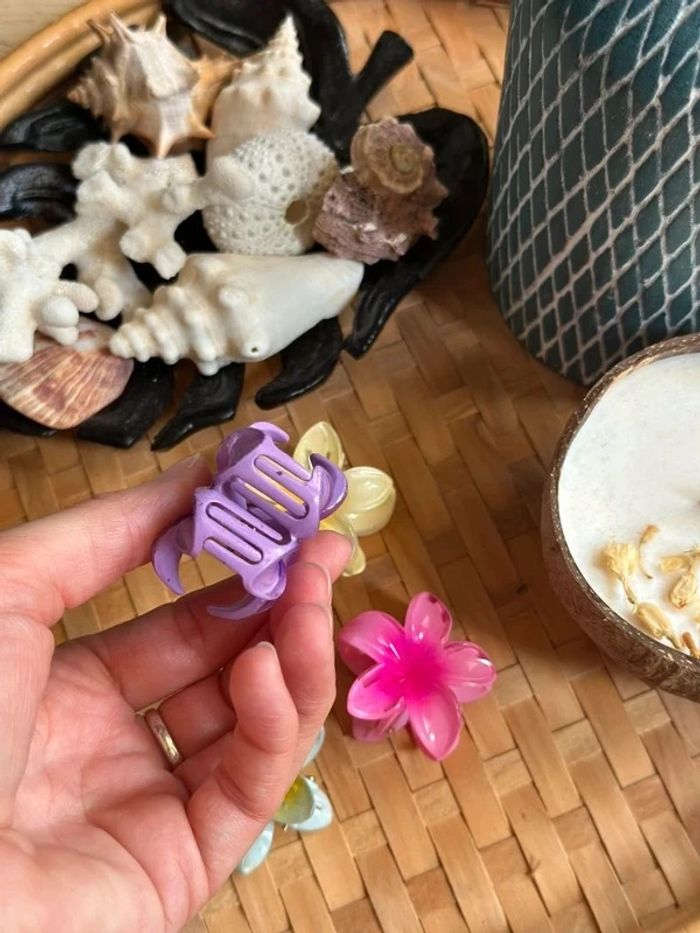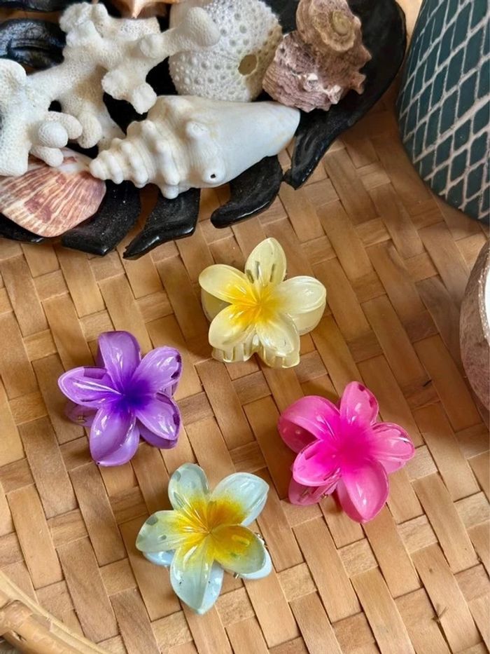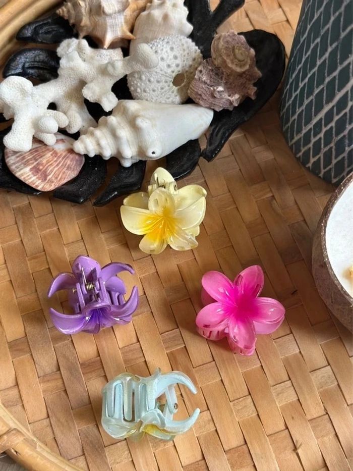 Pinces à cheveux en forme de fleur, neuves et jamais utilisées. Très bonne tenue, parfaites pour attacher les cheveux, même épais. Design élégant et original, idéal pour ajouter une touche stylée à vos coiffures. → Prix: 1€50 la pince (la jaune est vendu) • Diamètre 4 cm.