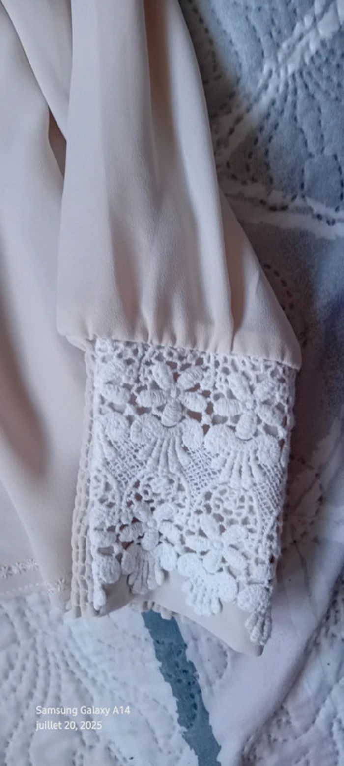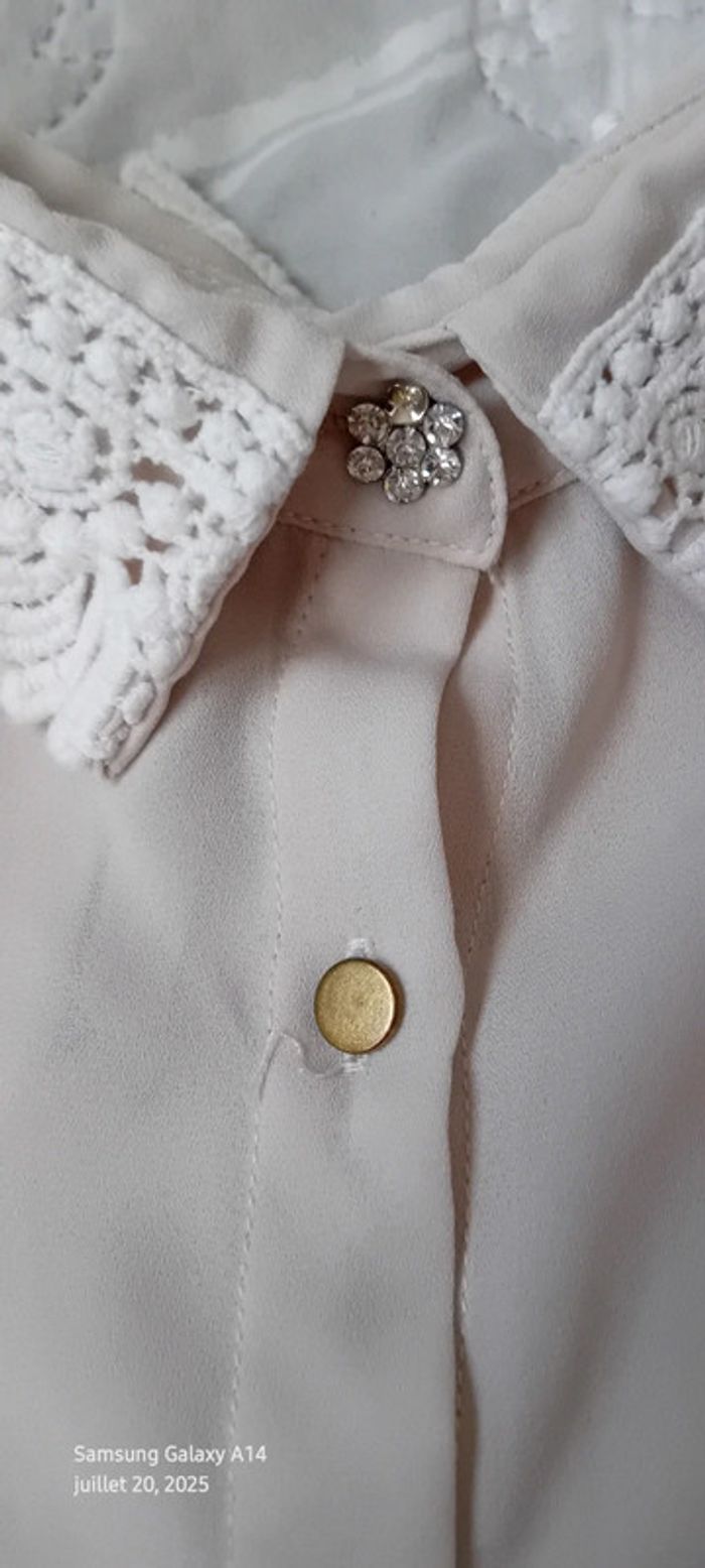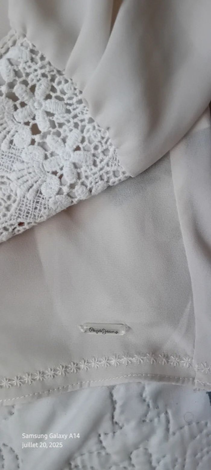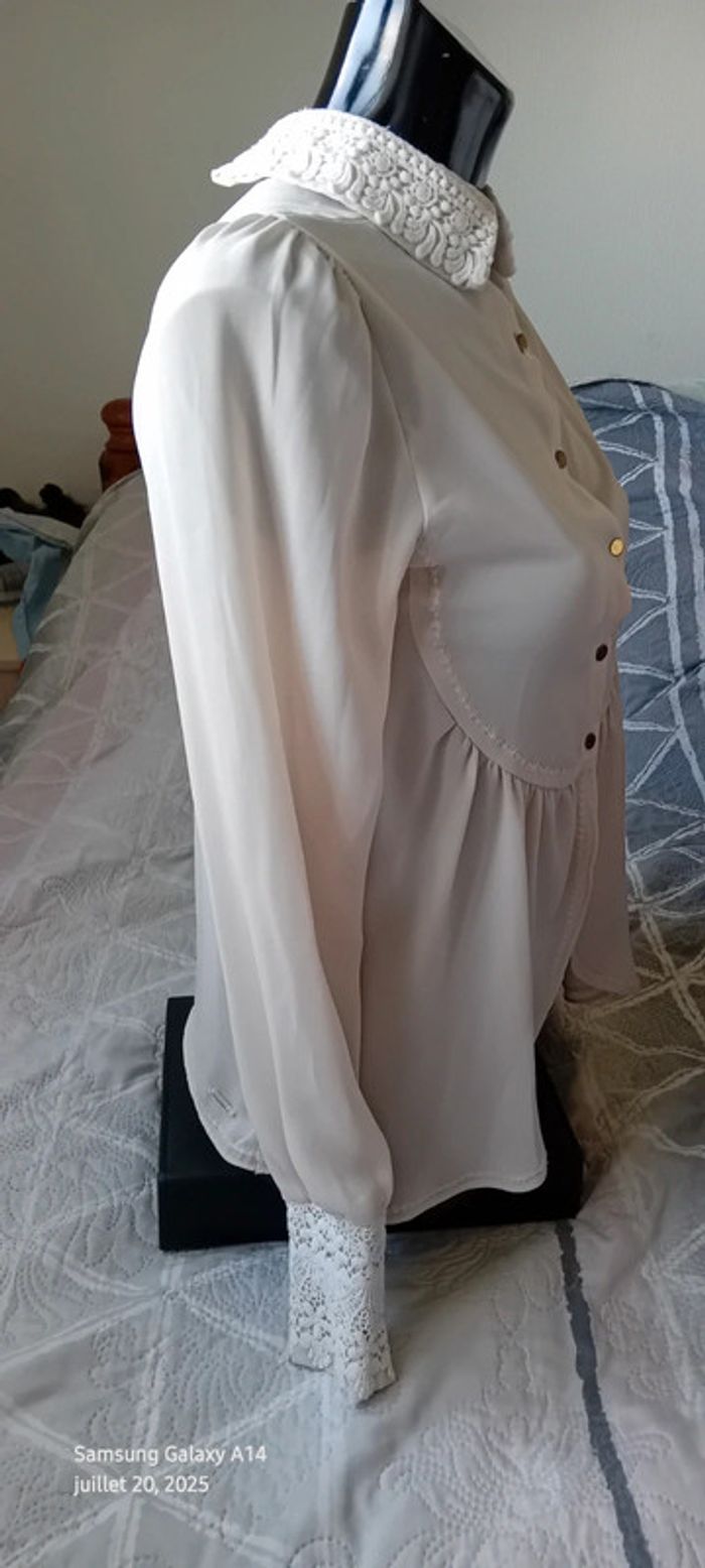 Blouse en polyester matière fluide et légère semi transparente boutons dorés devant broderies macramé au col et manches liseré de broderies devant longueur 61 cm largeur aisselles à aisselles 44 cm largeur épaules 32 cm longueur manches 62 cm très peu portée en très bon état #midole #midolefemme #midolefemme34 #pepejean #blousefemme34 #blouseenvoile #blouseavecbroderies34 #blousepepejeans #ecru