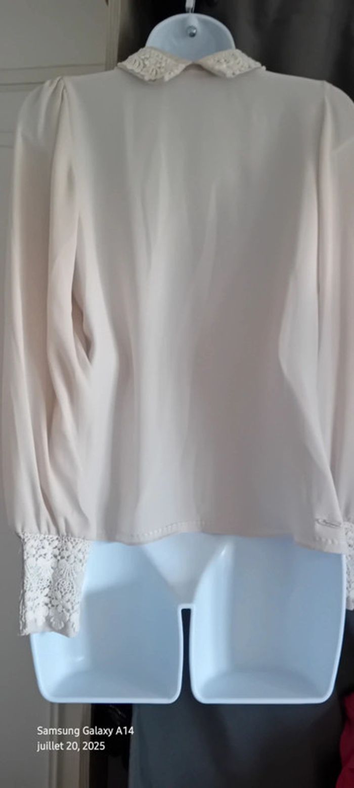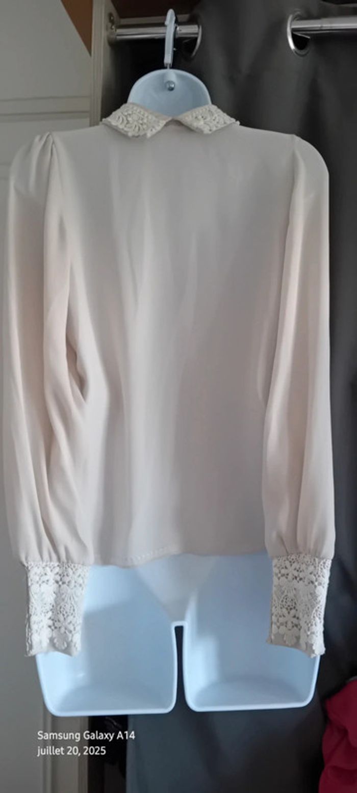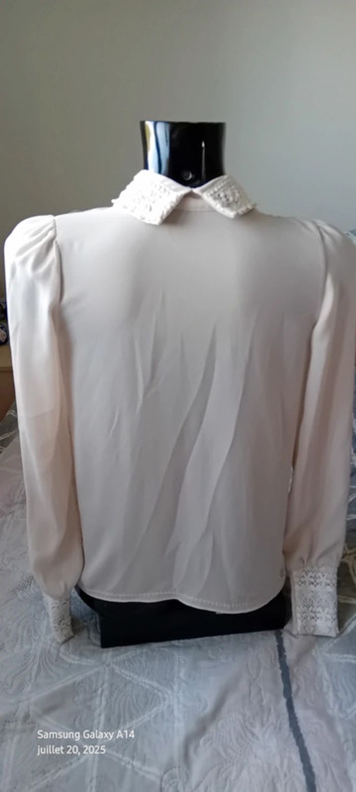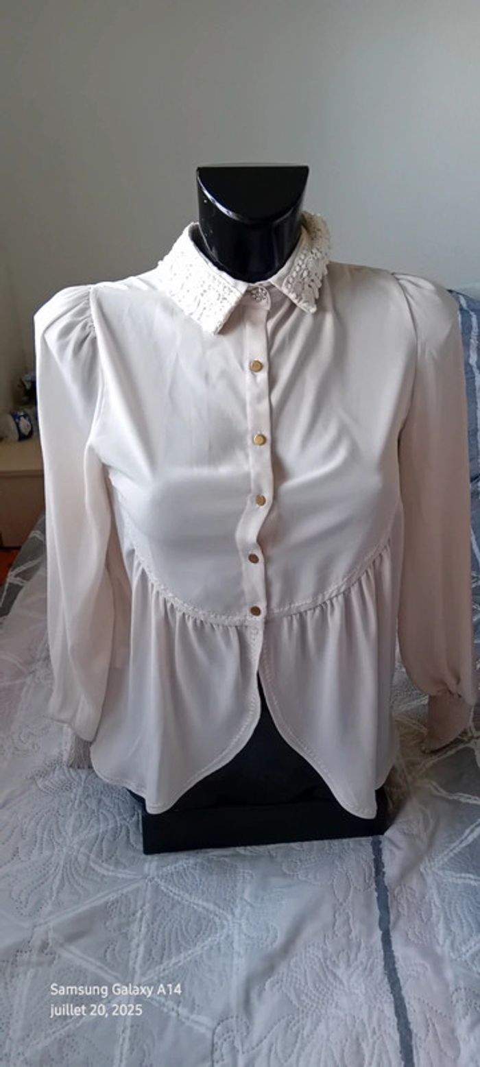 Blouse en polyester matière fluide et légère semi transparente boutons dorés devant broderies macramé au col et manches liseré de broderies devant longueur 61 cm largeur aisselles à aisselles 44 cm largeur épaules 32 cm longueur manches 62 cm très peu portée en très bon état #midole #midolefemme #midolefemme34 #pepejean #blousefemme34 #blouseenvoile #blouseavecbroderies34 #blousepepejeans #ecru