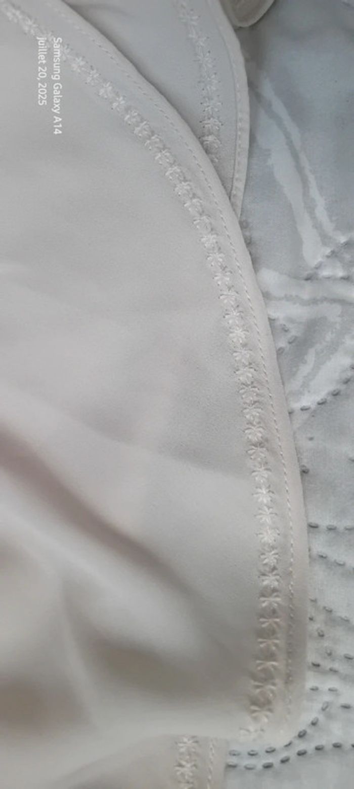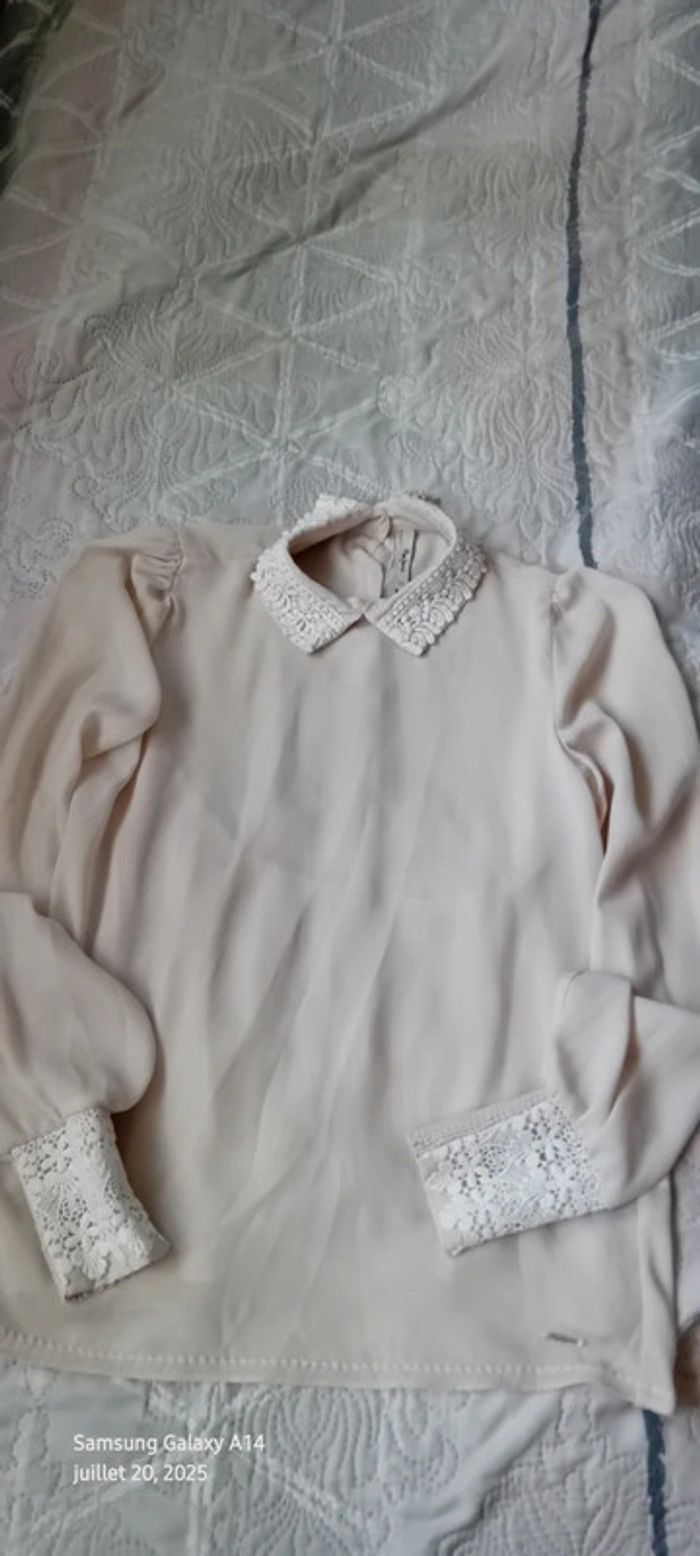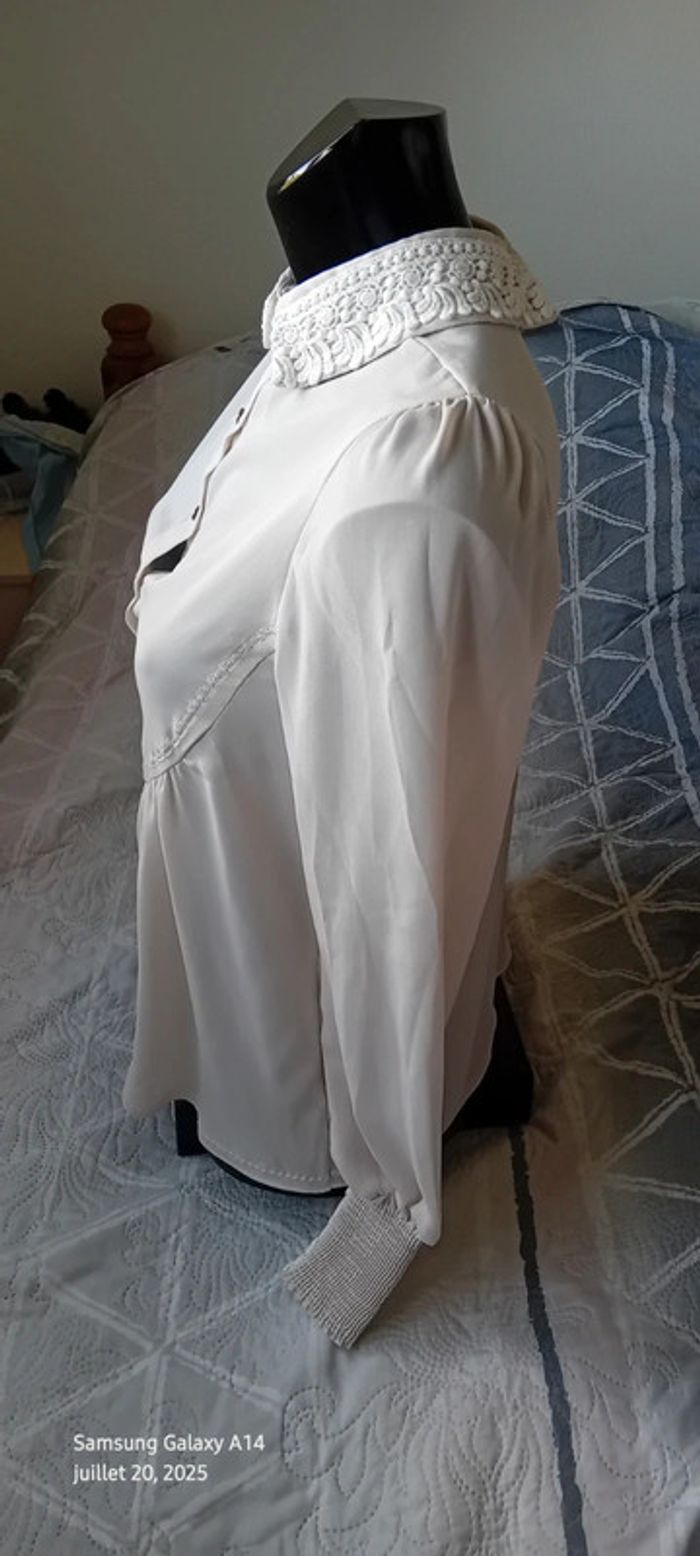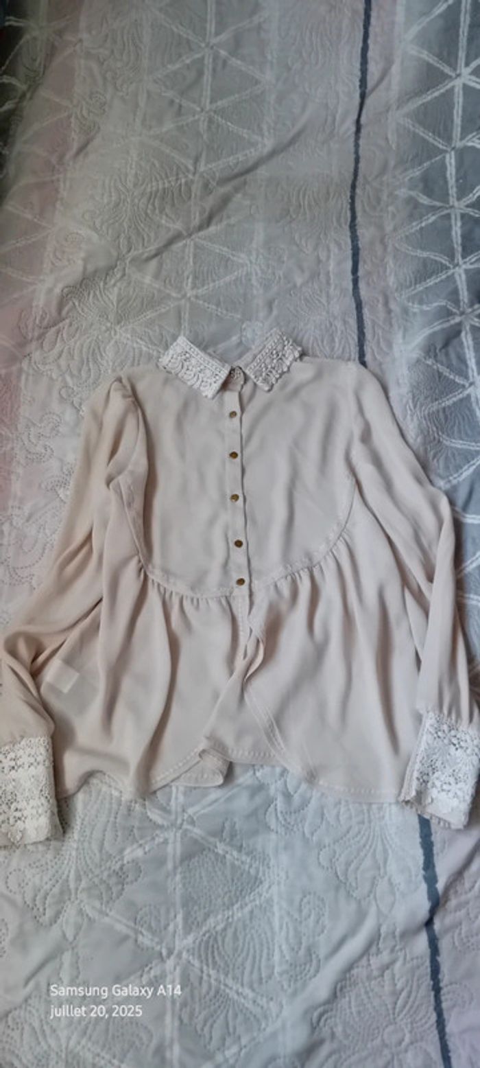 Blouse en polyester matière fluide et légère semi transparente boutons dorés devant broderies macramé au col et manches liseré de broderies devant longueur 61 cm largeur aisselles à aisselles 44 cm largeur épaules 32 cm longueur manches 62 cm très peu portée en très bon état #midole #midolefemme #midolefemme34 #pepejean #blousefemme34 #blouseenvoile #blouseavecbroderies34 #blousepepejeans #ecru