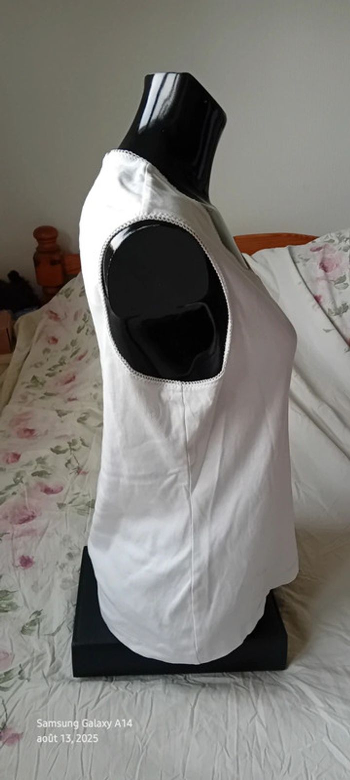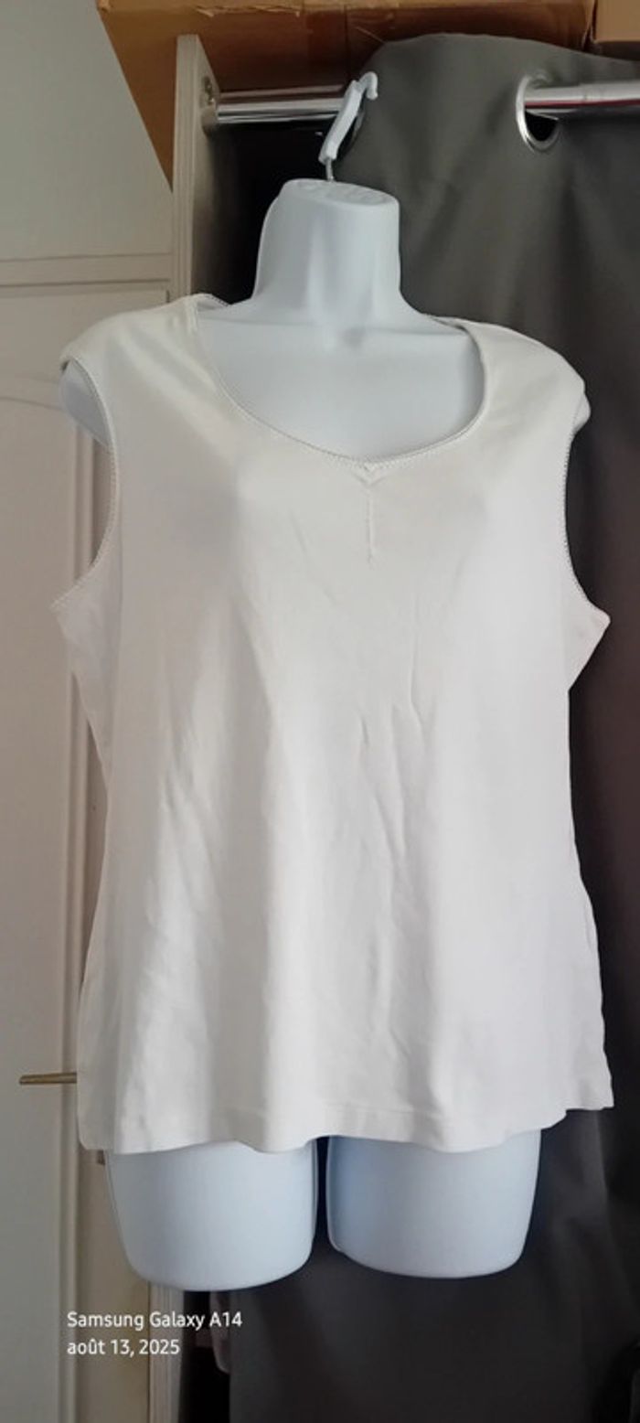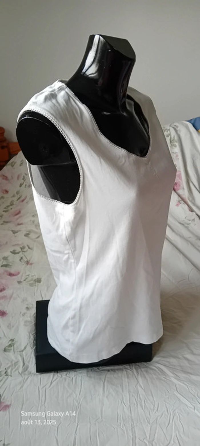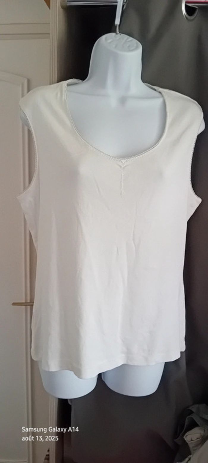 Haut sans manches en coton col arrondi égèrement en V dentelé au col et aux épaules longueur 61 cm largeur aisselles à aisselles 47 cm largeur épaules 41 cm largeur bas 48 cm taille L 40/42 très peu porté en très bon état #midole #midolefemme #midolefemme40 #femme40 #hautfemme40 #debardeurfemme40 #hautsansmanches #hautblanc #hautphildar #phildar