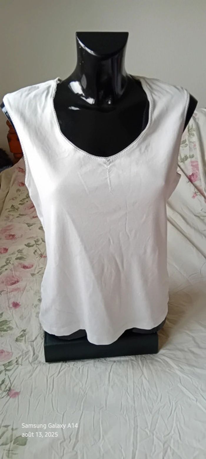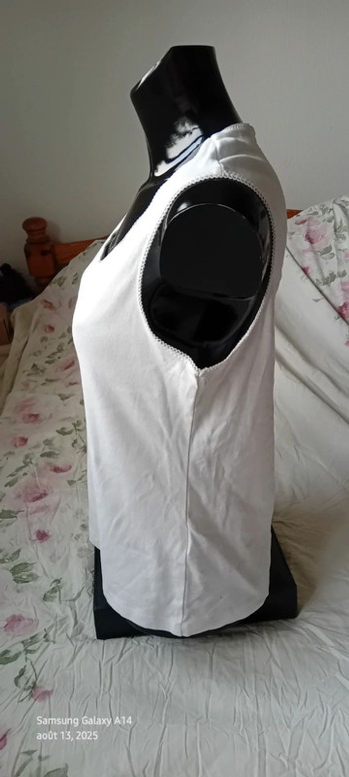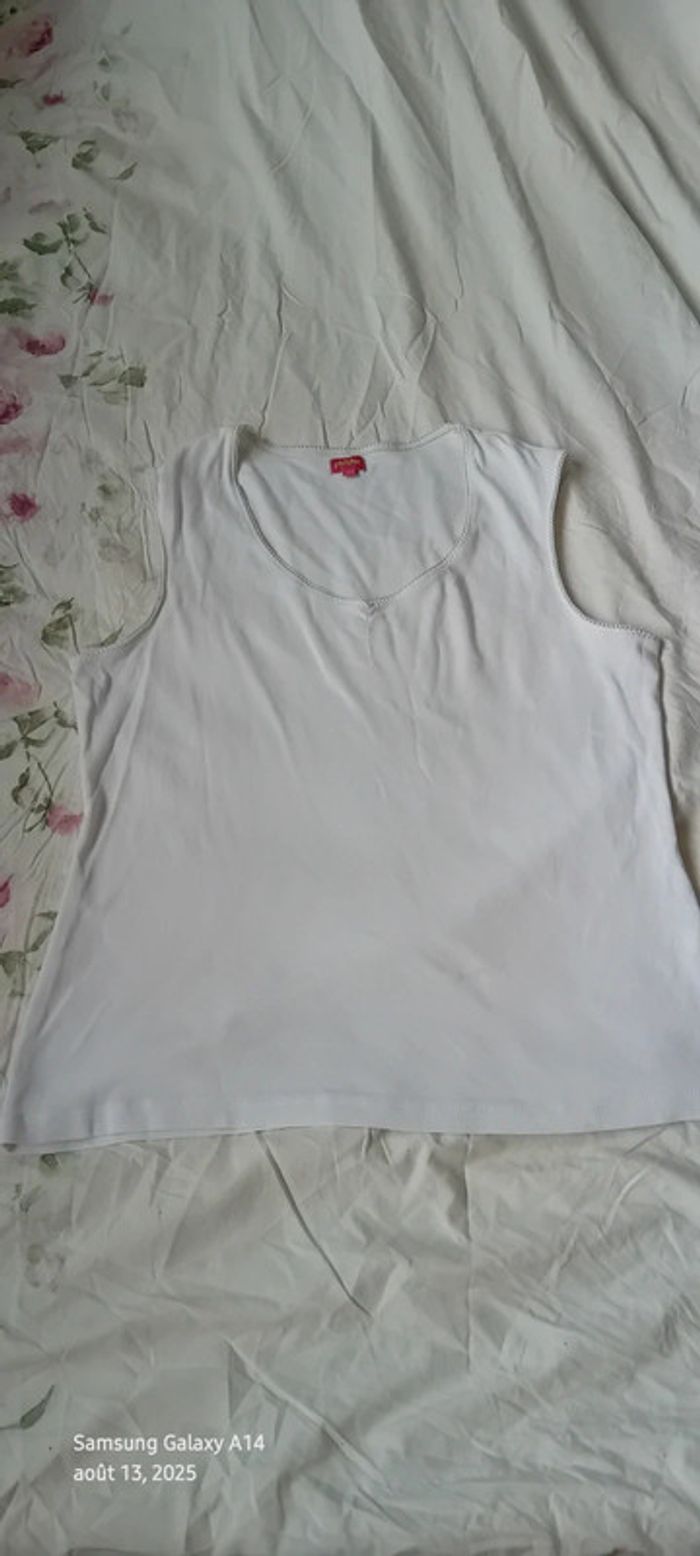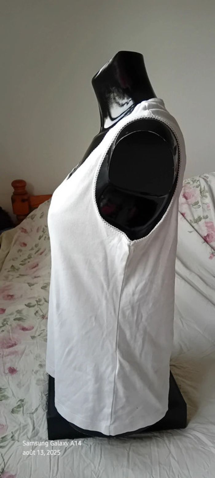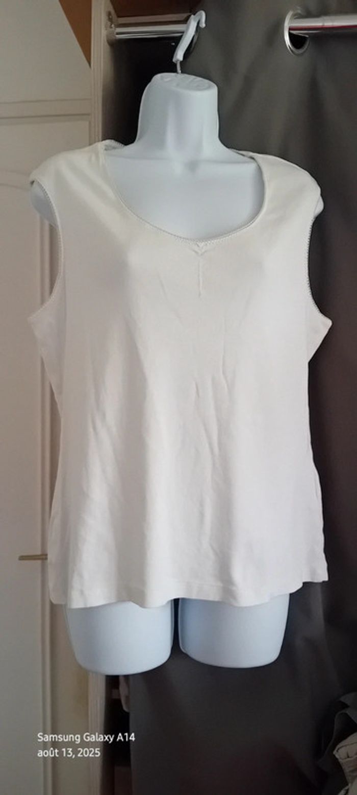 Haut sans manches en coton col arrondi égèrement en V dentelé au col et aux épaules longueur 61 cm largeur aisselles à aisselles 47 cm largeur épaules 41 cm largeur bas 48 cm taille L 40/42 très peu porté en très bon état #midole #midolefemme #midolefemme40 #femme40 #hautfemme40 #debardeurfemme40 #hautsansmanches #hautblanc #hautphildar #phildar