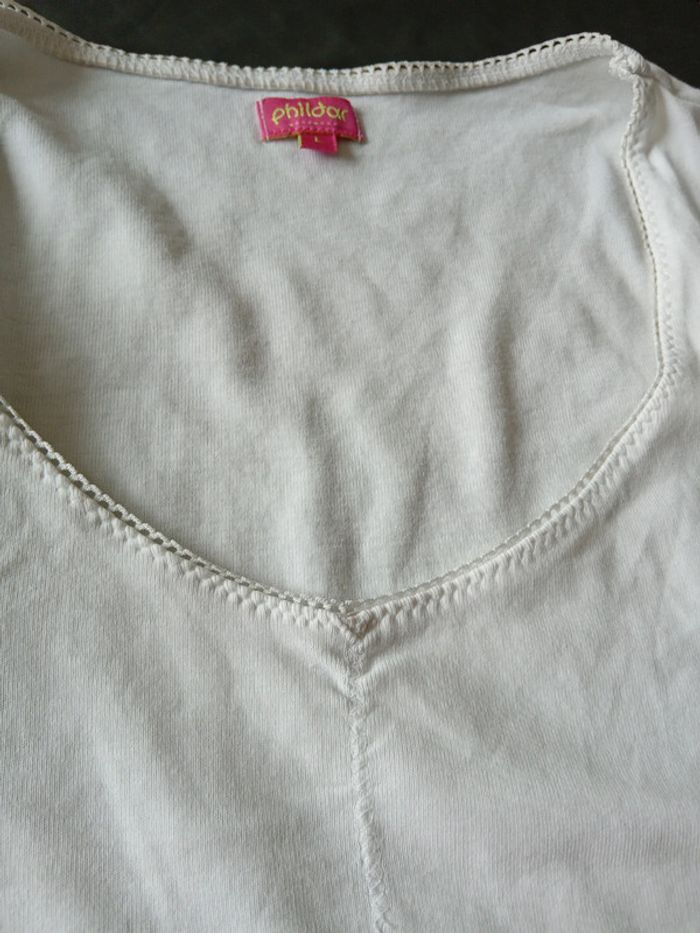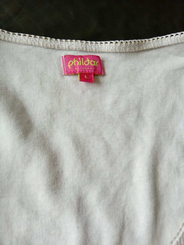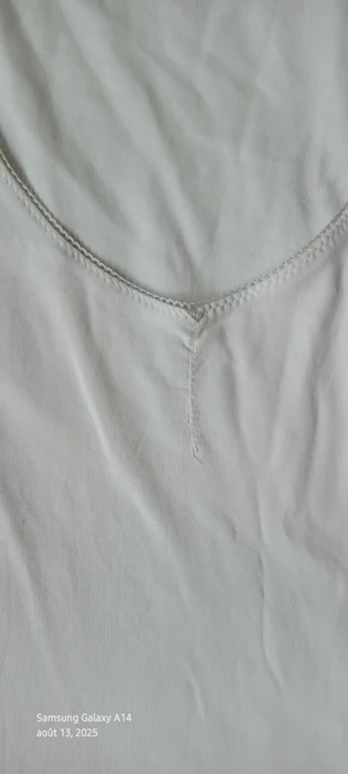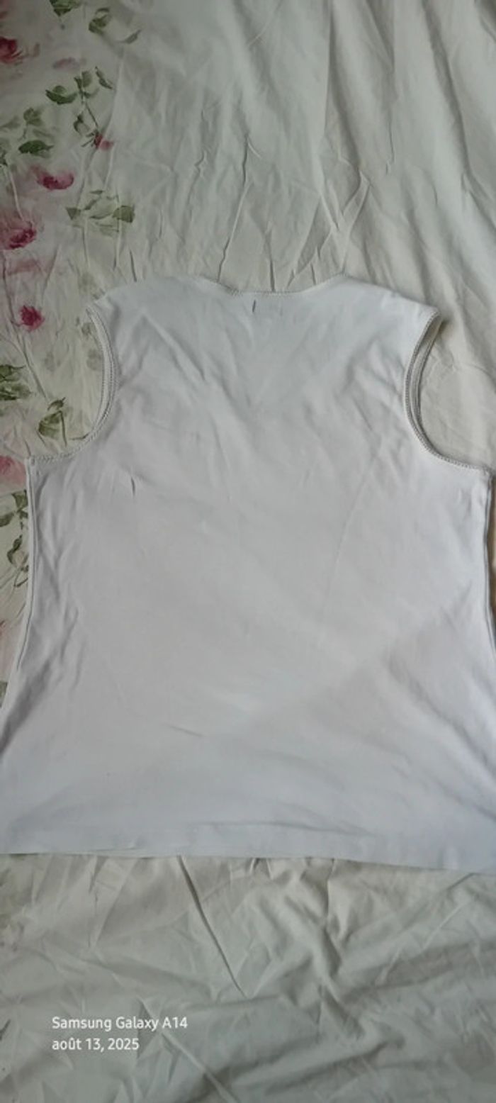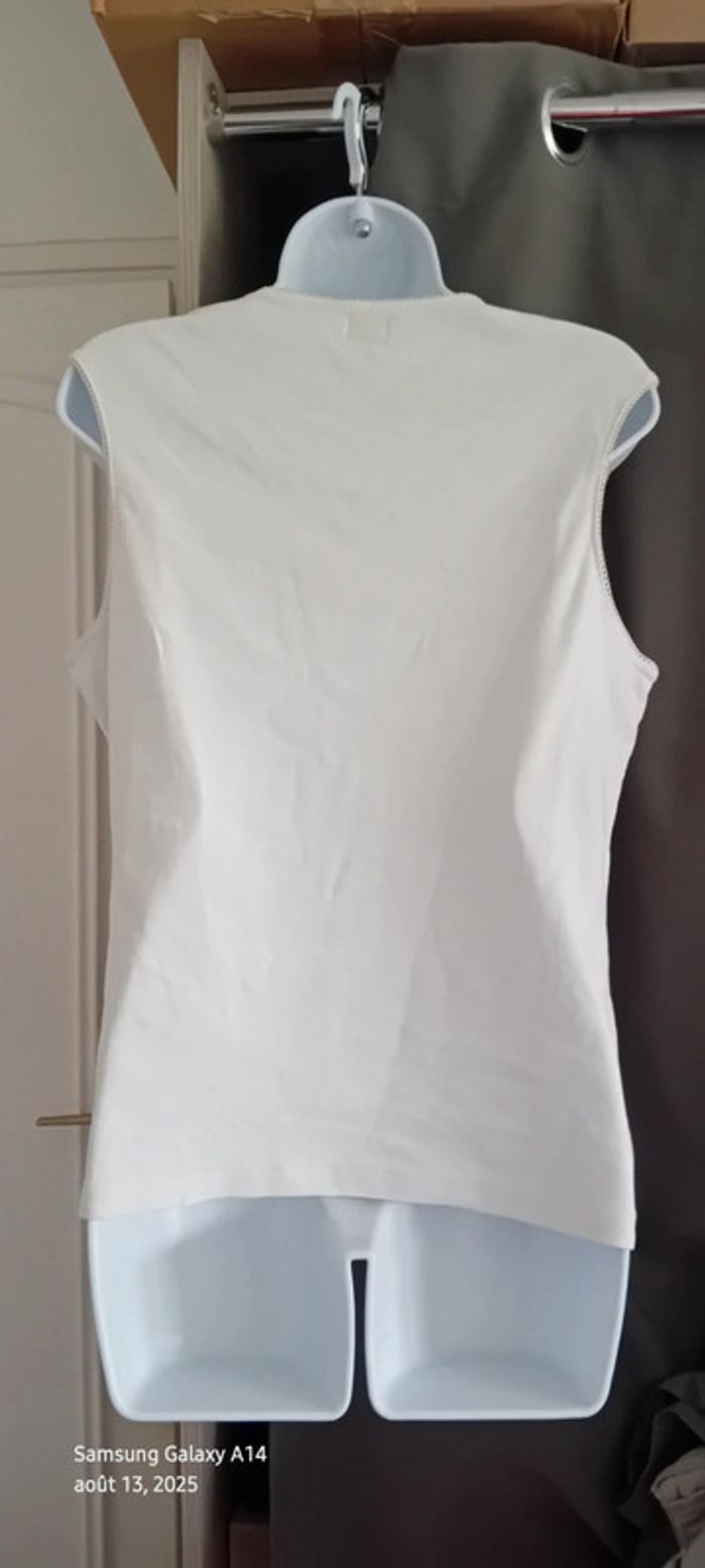 Haut sans manches en coton col arrondi égèrement en V dentelé au col et aux épaules longueur 61 cm largeur aisselles à aisselles 47 cm largeur épaules 41 cm largeur bas 48 cm taille L 40/42 très peu porté en très bon état #midole #midolefemme #midolefemme40 #femme40 #hautfemme40 #debardeurfemme40 #hautsansmanches #hautblanc #hautphildar #phildar