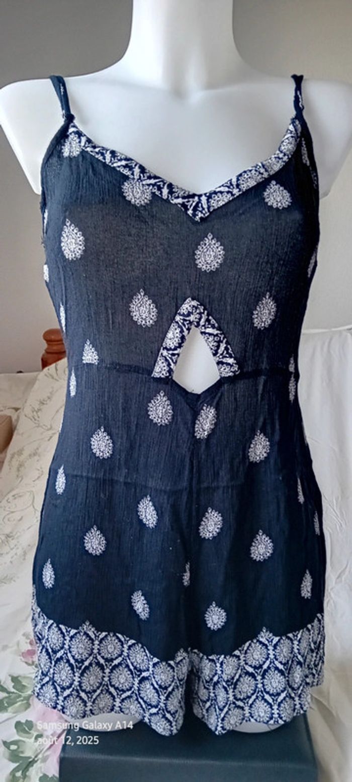 Combishort court fines bretelles réglables en viscose effet plissé ouverture en triangle devant fermeture éclair au dos longueur 78 cm largeur aisselles à aisselles 45 cm largeur bretelles à bretelles 30 cm tour de taille 82 cm correspond à un 38/40 porté quelques fois en très bon état ⚠️ juste quelques petites peluches par endroit dues aux lavages #midole #midolefemme38 #midolefemme #combishort #combishortfinesbretelles #combishortfemme38 #combishortmotifindien #impriméindien #jennyfer